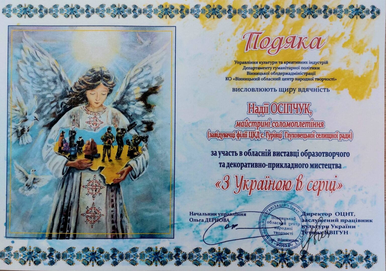 Чудова новина для культурного осередку Гуховецької громади. Майстриня соломоплетіння, завідувачка філії Центру культури та дозвілля с. Гурівці — Надія ОСІПЧУК — отримала високу відзнаку на обласному рівні.