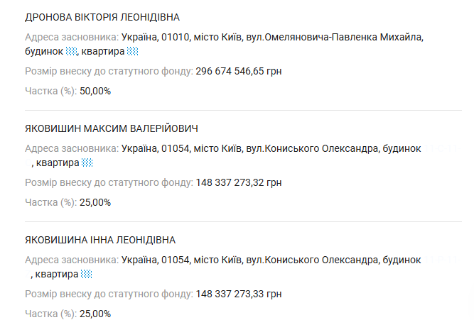 50 відсотків статутного капіталу аграрної імперії покійного Леоніда Яковишина перейшли до його дочки Вікторії Дронової. Її внесок становить 296 674 546,65 гривні. По 25 відсотків дісталося Інні та Максиму Яковишиним — другій дочці та внуку. Розмір їхніх внесків до статутного капіталу — по 148 337 273 гривні. Розподіл часток зафіксовано в державному реєстрі юридичних осіб, — такі дані оприлюднила аналітична система YouControl.