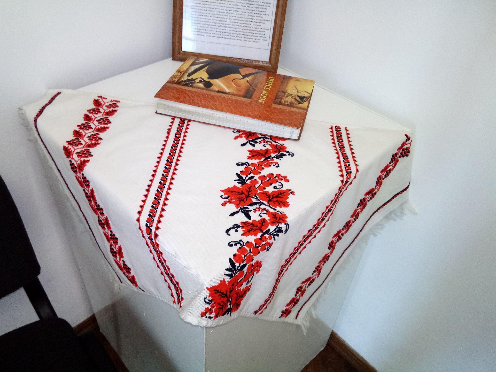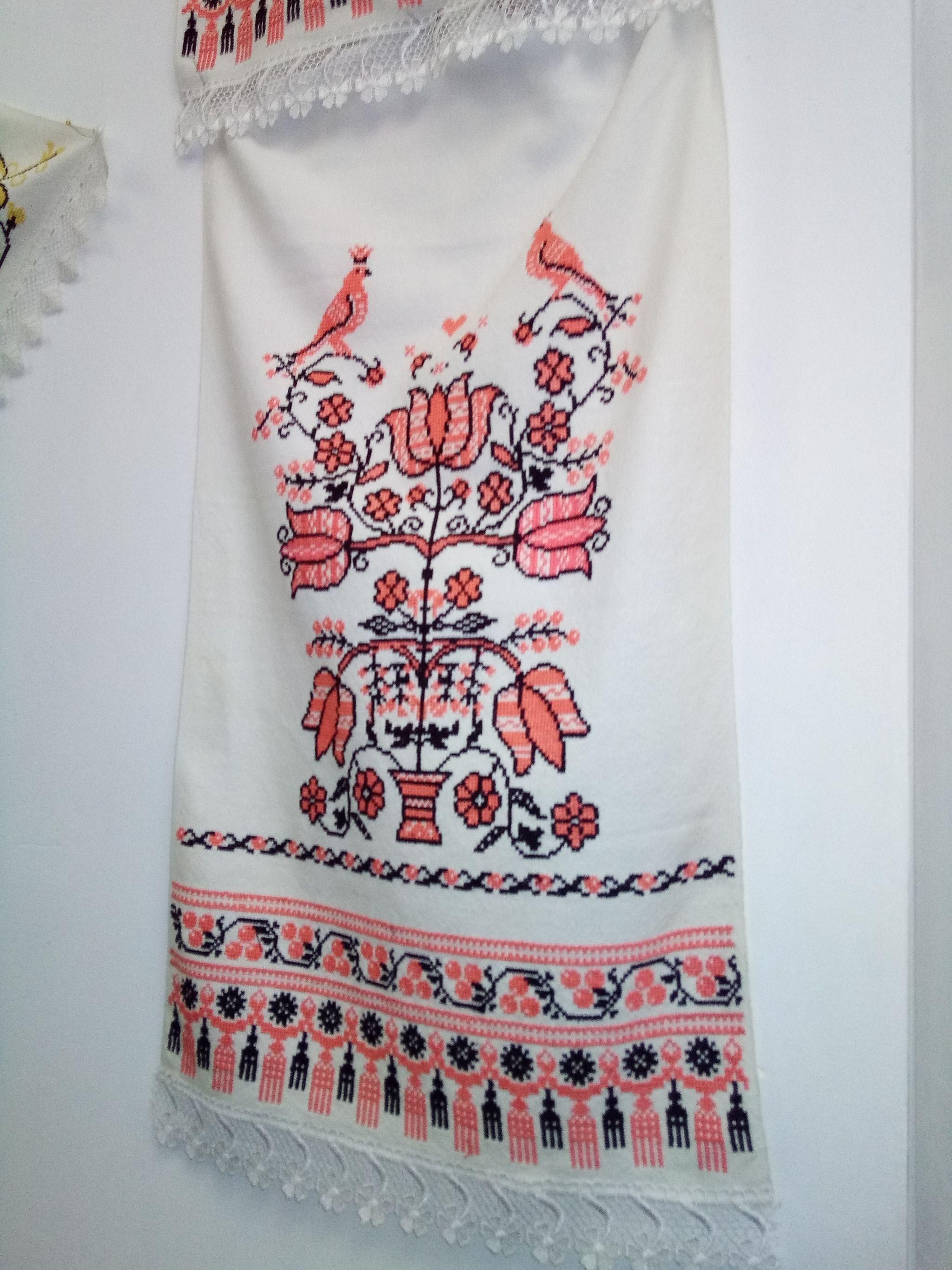 Є тут рушник, на якому узори з Вінниччини. Тут використаний прийом обрамлення. Його називають поквітчення.