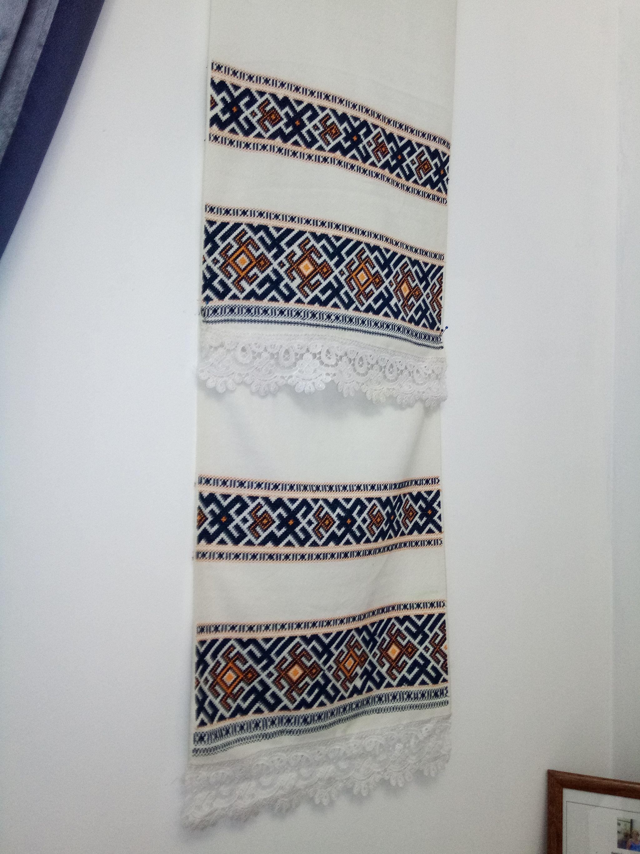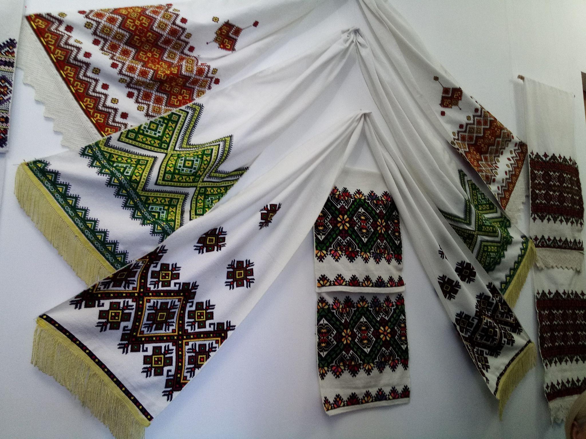 На нижньому рушнику узори з Івано-Франківщини. Посередині - фантазійний рушник. Над ним - весільний.