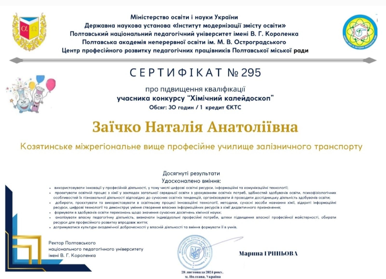 - Студенти Козятинського залізничного училища, які навчаються на ІІ-ому курсі за професією «Кухар. Кондитер. Офіціант», брали участь у Всеукраїнському конкурсі «Хімічний калейдоскоп» за номінацією «Хімічні дослідження»