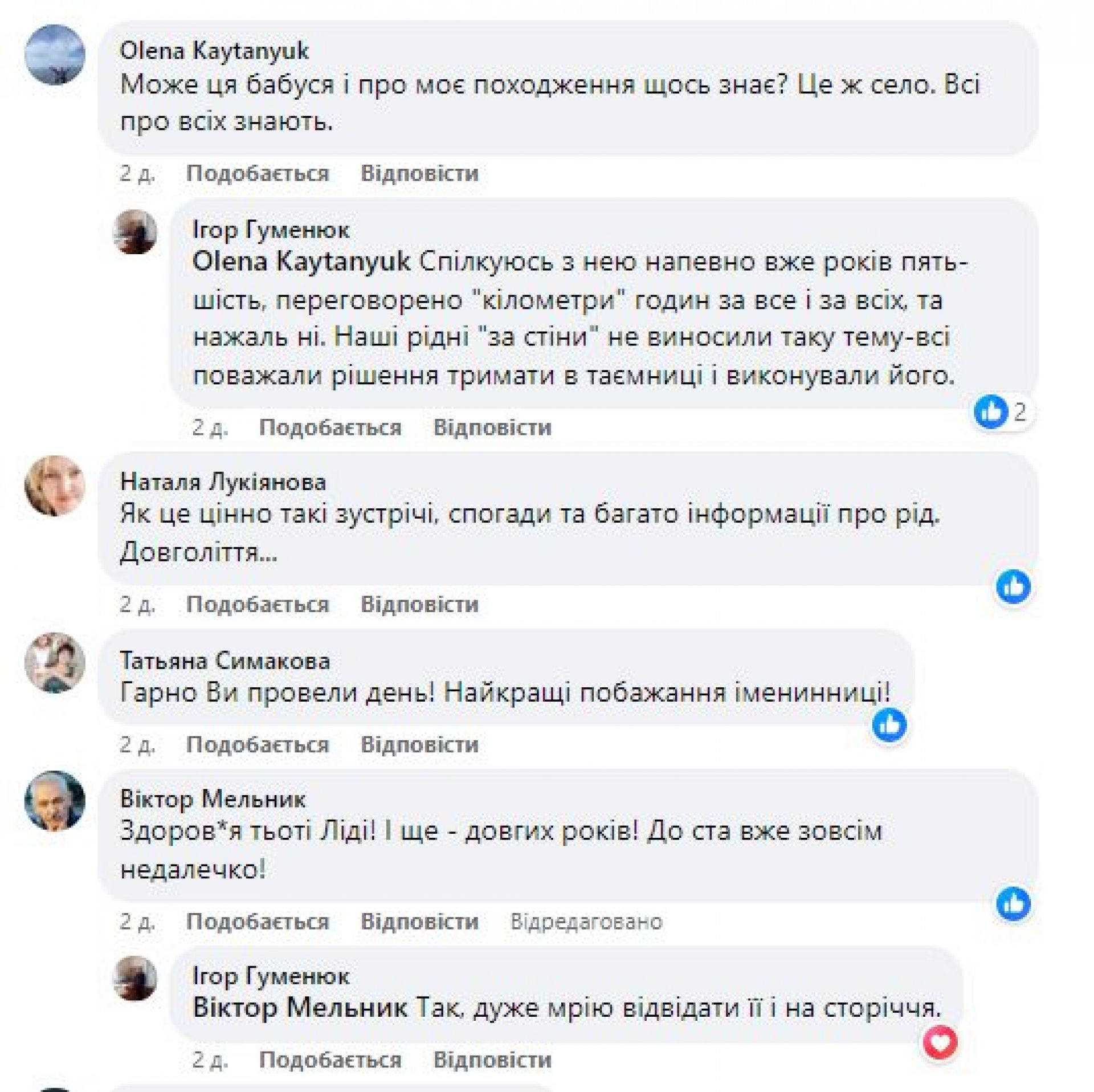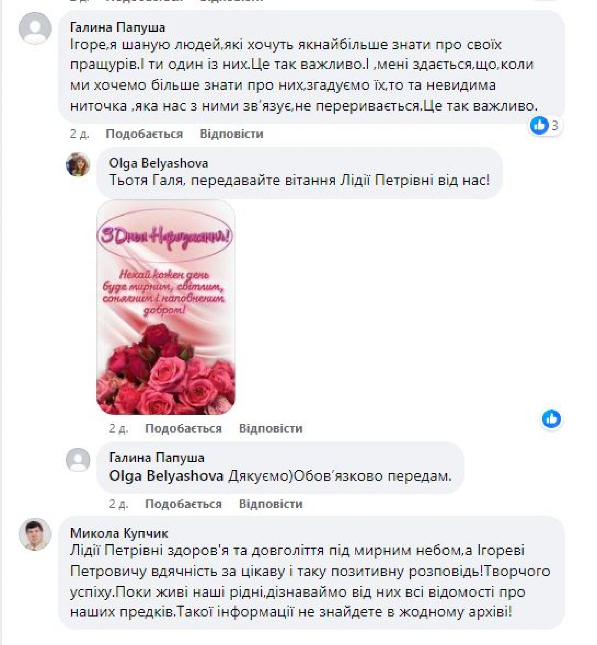— Це, свого роду, безцінна інформація для мене особисто та мого дослідження історії роду, який походить з с. Вівсяники. І все це мені вдалося дізнатися завдяки простій розмові-балачці з нею, з живим свідком різних унікальних історичних подій, які вона проживала особисто. Знаходьте час, вирушайте в дорогу до своїх рідних – близьких і дальніх, знаходьте можливості, відправляйтесь на власному транспорті, наймайте транспорт (не шкодуйте коштів-ліпше витратити їх на дорогу до рідних старожилів і провести цікаву розмову-балачку, ніж купувати круті телефони чи щось подібне), їдьте з пересадками і в будь-яку погоду, але їдьте, бо час минає… Дуже сподіваюсь, що ще не раз завітаю до Лідії Петрівни і цікаво поспілкуюсь з нею та її дочкою Галиною (моєю сестрою в четвертому коліні). — підсумував Ігор