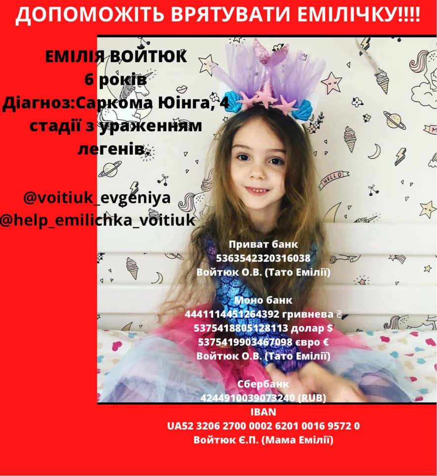 Родина просить близьких, друзів, знайомих і просто не байдужих людей допомогти подолати страшну хворобу. Адже самотужки вони не впораються з таким важким і довготривалим лікуванням. Попереду — шість курсів хіміотерапії, трансплантація кісткового мозку та трансплантація ураженої частини кістки. А для цього потрібно сила та велика сума грошей. Рахунок на лікування Емілії ще не виставили, адже чекають на відповідь з ізраїльської клініки, куди направили всі необхідні для того документи.