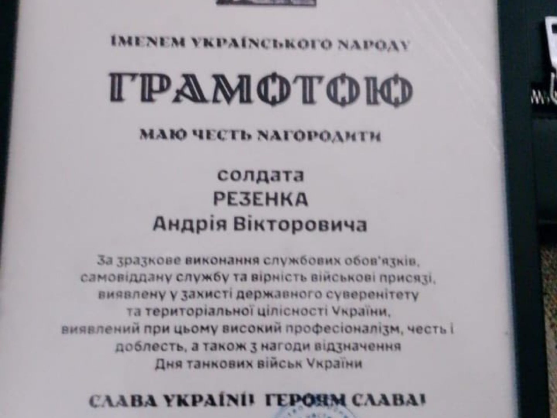Наш земляк Андрій Резенко отримав почесну грамоту від командування ЗСУ