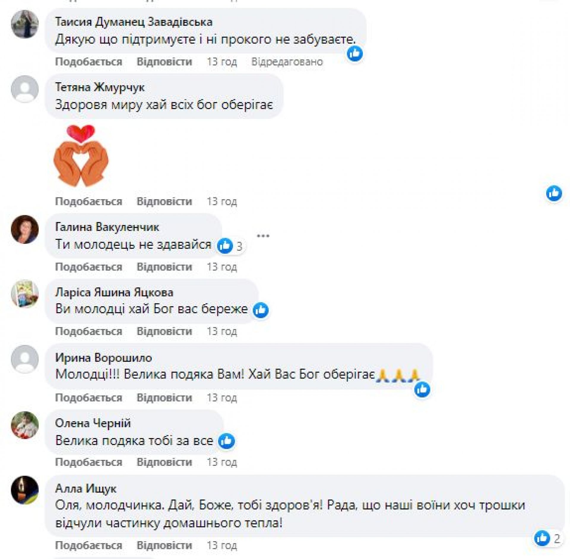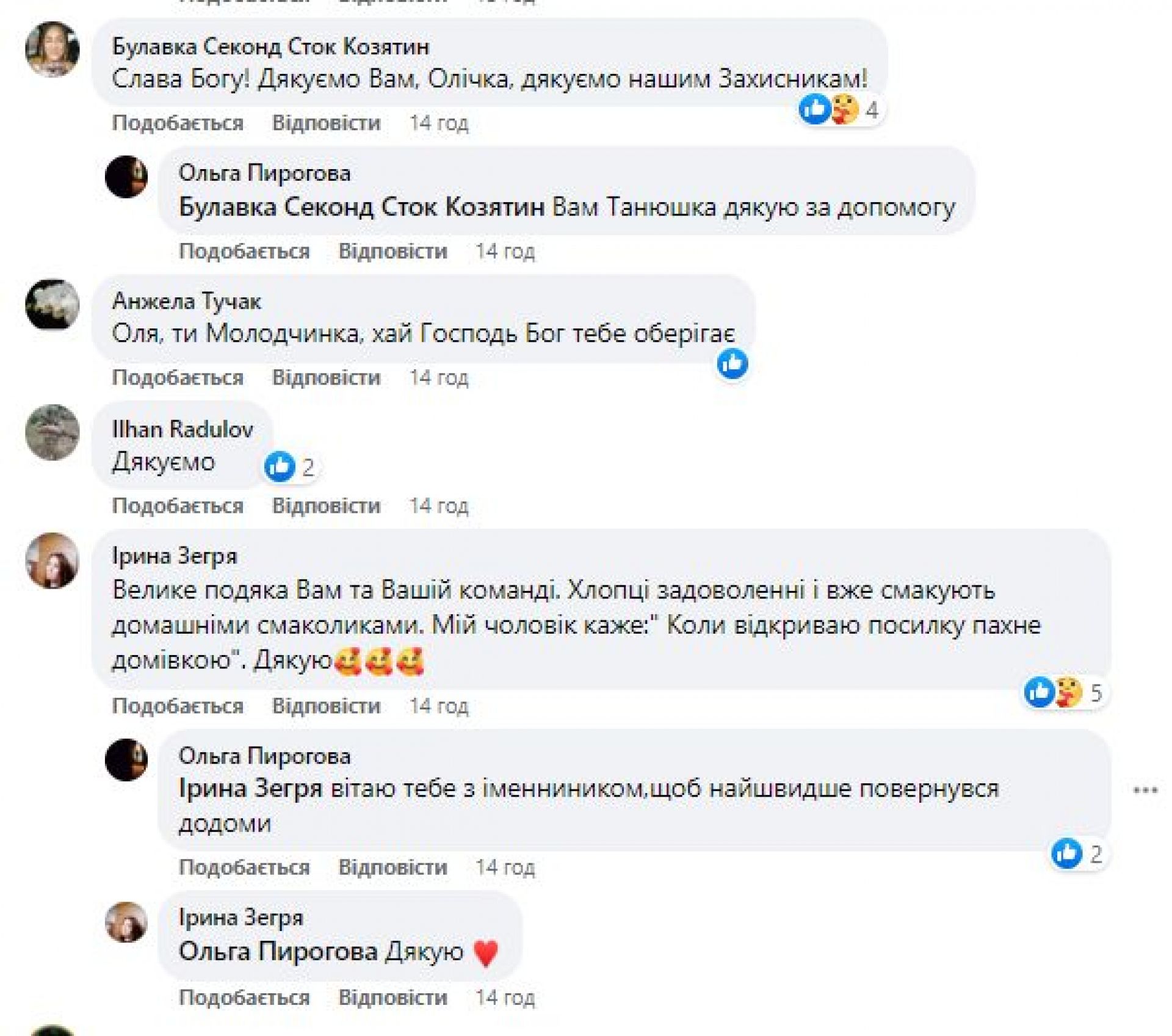 - Військові дякують за таку підтримку, а Ольга дякує всім тим, хто допомагав їй в організації доставки