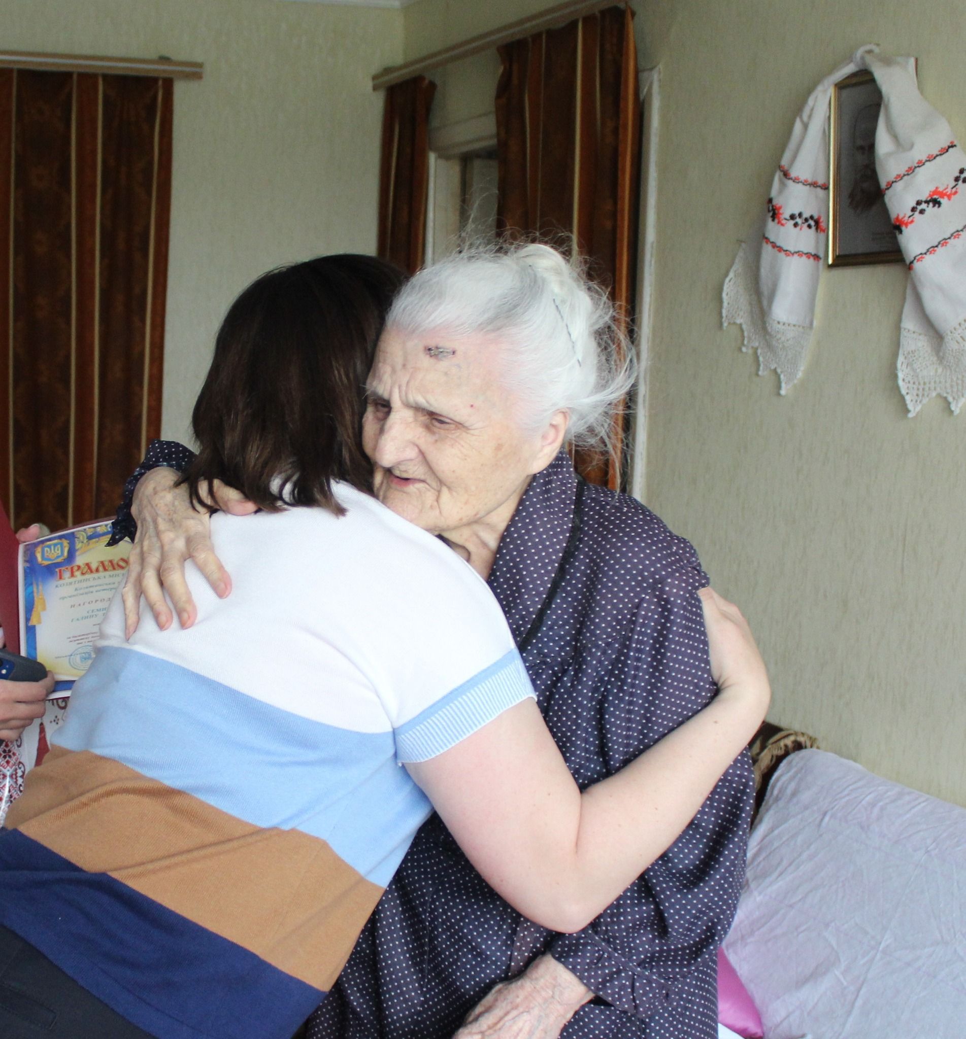 Шановну та поважну ювіляршу привітали з такою важливою датою, вручили грамоту, подарунок та матеріальне заохочення, заслухали історії з життя.