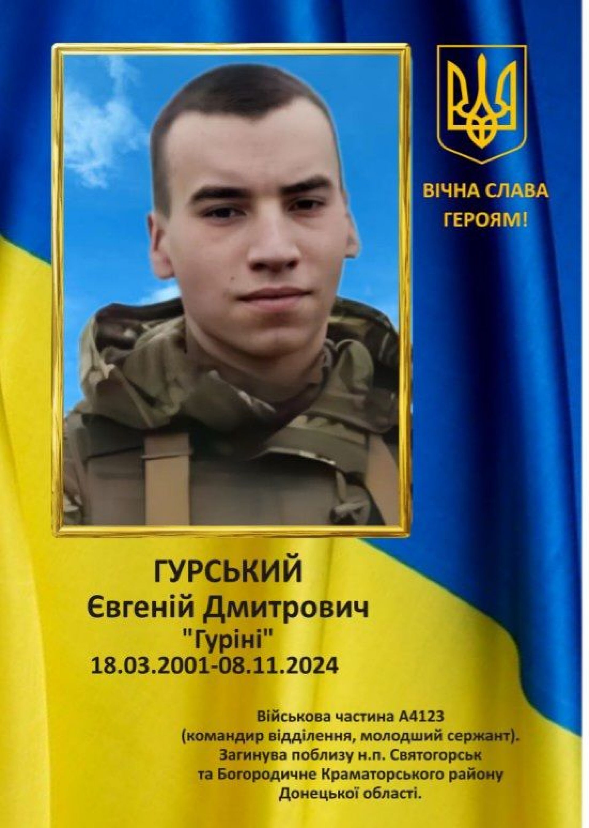 - Минає перша річниця з того дня, 8 листопада 2024, як у запеклих боях обірвалося життя відважного воїна, Героя, молодшого сержанта Гурського Євгенія Дмитровича. Громада Поличинецького округу схиляє голову перед пам'яттю земляка, який віддав життя за долю України.