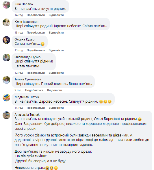 — Світла та вічна пам'ять нашому колезі, професіоналу своєї справи, чудовому вчителю, надійному та щирому другові, доброзичливій людині. Висловлюємо найщиріші співчуття дружині Ользі Борисівні, сину та всій родині. Поділяємо Ваше горе, сумуємо разом з Вами, підтримуємо Вас у годину скорботи.