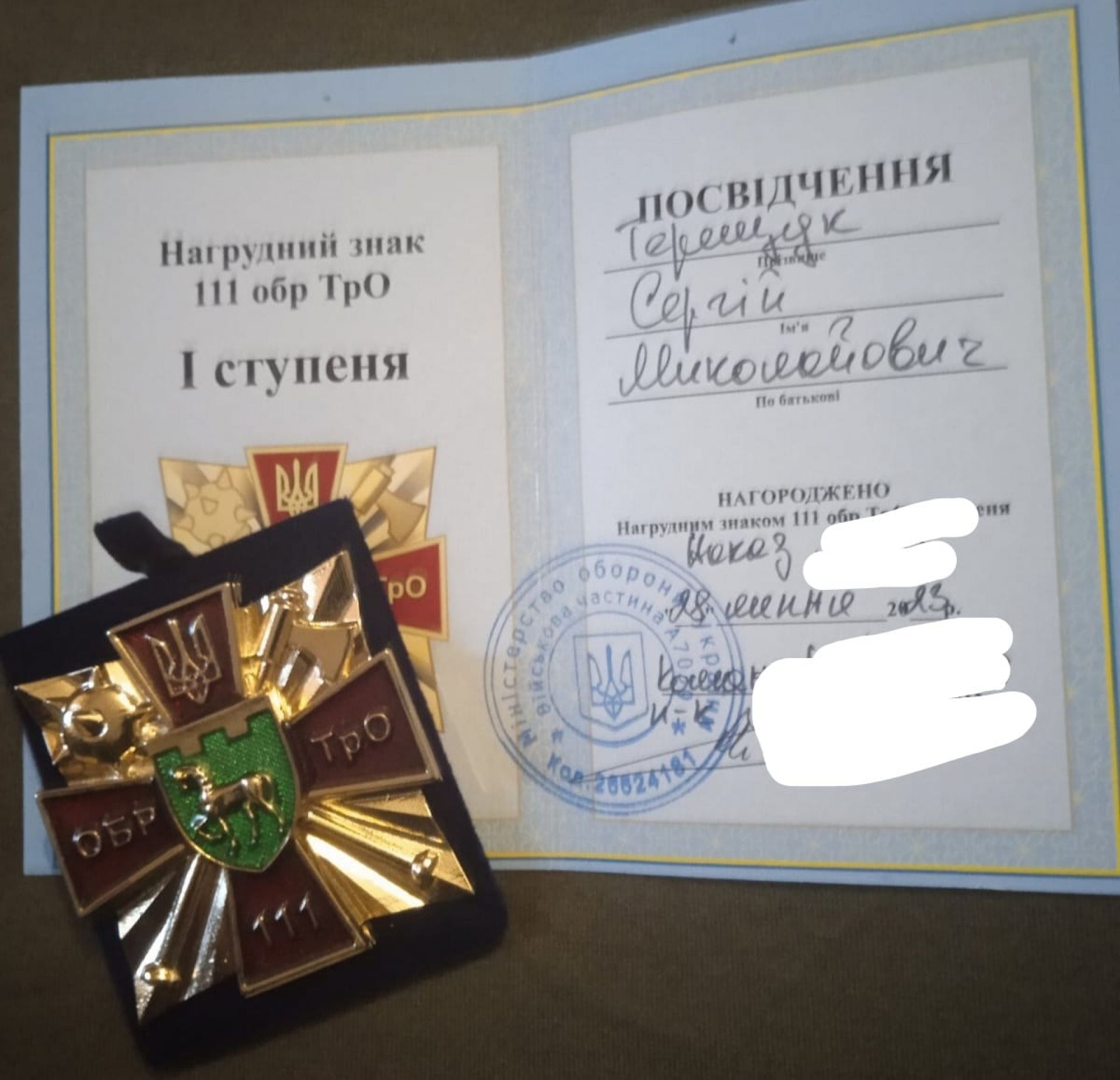 - Сергій Терещук, 1992 року народження, мешканець Козятинської громади, отримав «нагрудний знак 111 обр ТрО 1 ступеня».