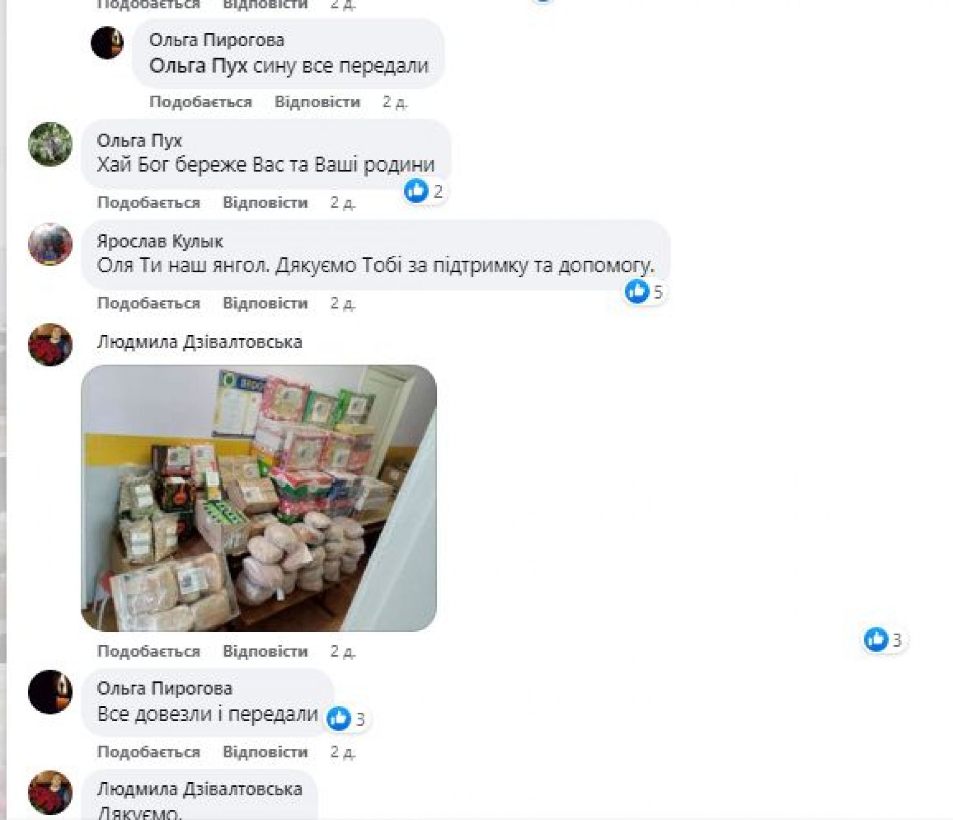А днями Ольга виклала ще один пост, де написала: «Ось так смакують ваші смаколики наші Захисники. Сьогодні скинули фото і слова вдячності усім Вам, дякую, працюємо далі»