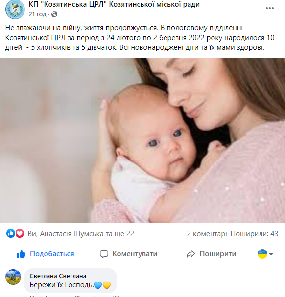 - Адміністрація Козятинської ЦРЛ повідомила про число новонародженних козятинців, які з'явилися на світ за сім діб війни в Україні