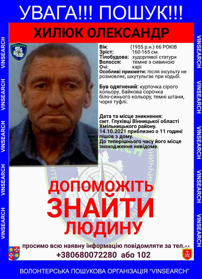 Волонтерська Пошукова Організація Вінниччини Vinsearch опублікувала пост про пошук глухівчанина Олександра Хилюка. Пишуть, що чоловік 14 жовтня, приблизно об 11.00 годині пішов з дому і до цього часу про місце знаходження нічого не відомо.