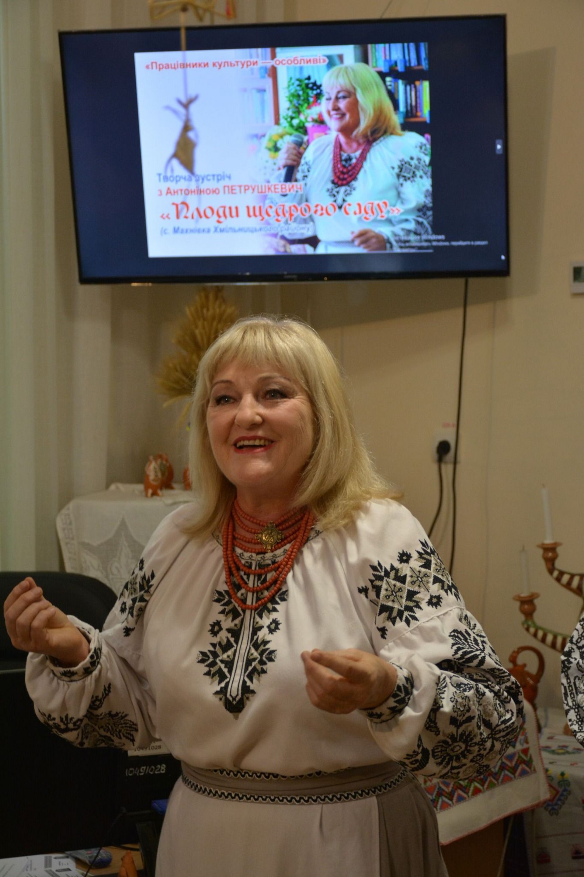 — Серед плеяди талановитих митців Вінниччини яскравими веселковими барвами виграє талант співачки, поетеси, композитора, члена НСПУ Антоніна Петрушкевич, — цитуємо допис. — Тема любові до рідної землі, до України стала однією з найголовніших у творчості мисткині. Випускниця Київського державного інституту культури імені О.Є.Корнійчука понад двадцять років працювала методистом, художнім керівником Калинівського РБК, де створила вокальний гурт «Калина». А нині Антоніна Кирилівна працює у Центрі дозвілля Махнівської сільської ради, де керує гуртом «Калина», який з 2017 року носить почесне звання «народний аматорський». Цей чудовий колектив понад сорок років обдаровує подолян неповторними піснями Антоніни Петрушкевич.