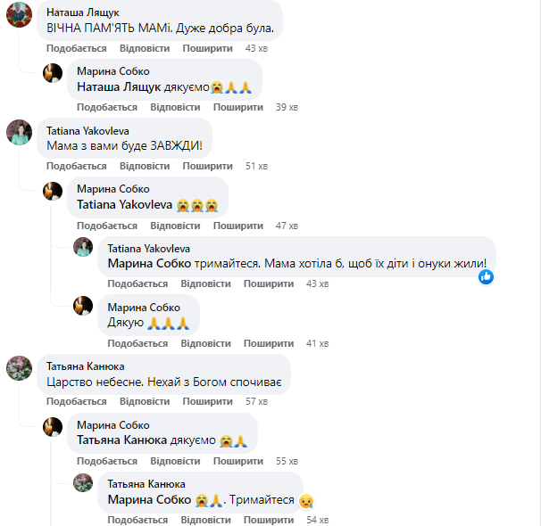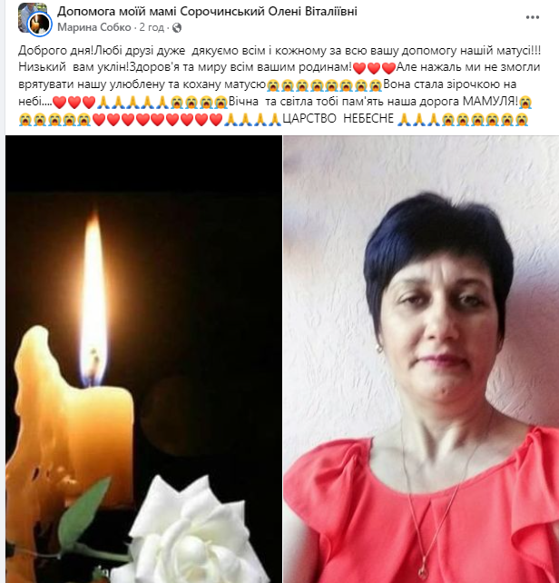 — Любі друзі, дуже дякуємо всім і кожному за всю вашу допомогу нашій матусі. Низький вам уклін. Здоров'я та миру всім вашим родинам! Але, на жаль, ми не змогли врятувати нашу улюблену та кохану матусю. Вона стала зірочкою на небі... Вічна та світла тобі пам'ять наша дорога мамуля. Царство небесне