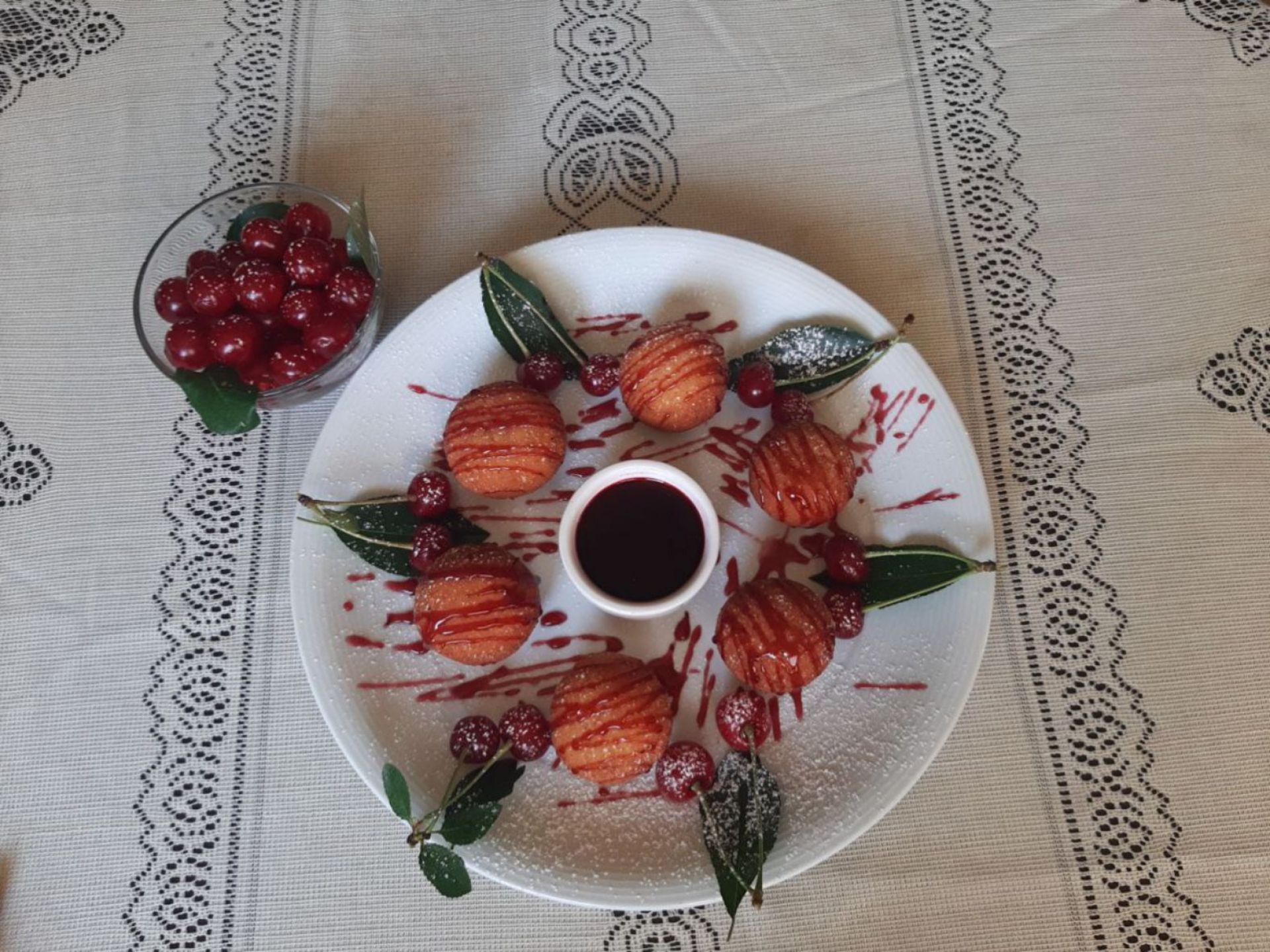 - Дівчина приготувала та презентувала «Крученики з беконом під вишневим соусом» та «Сирні пончики з вишнею».