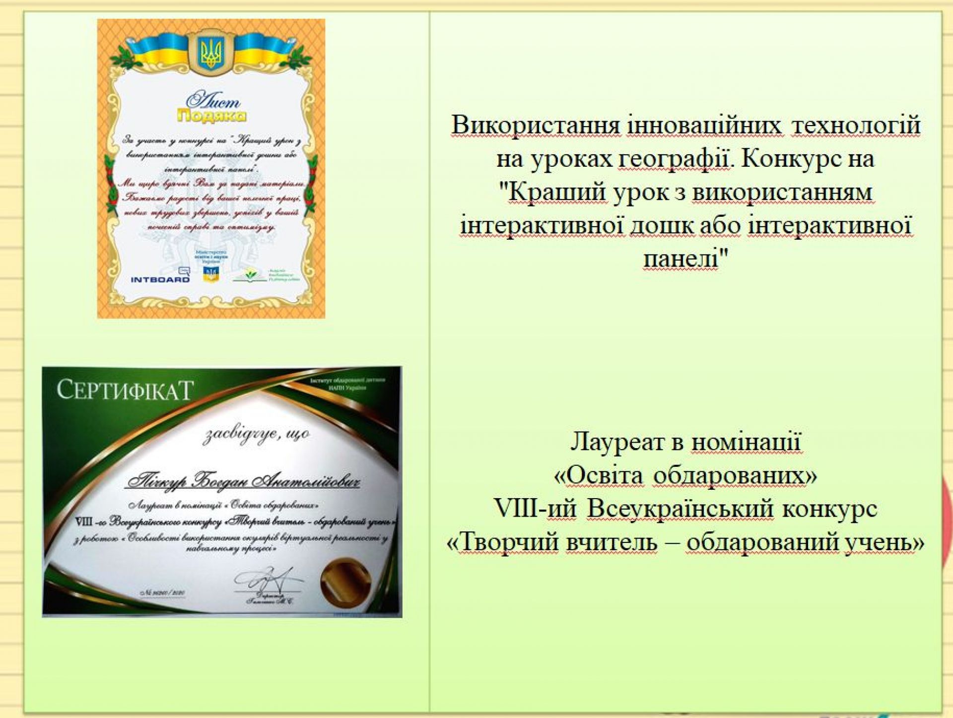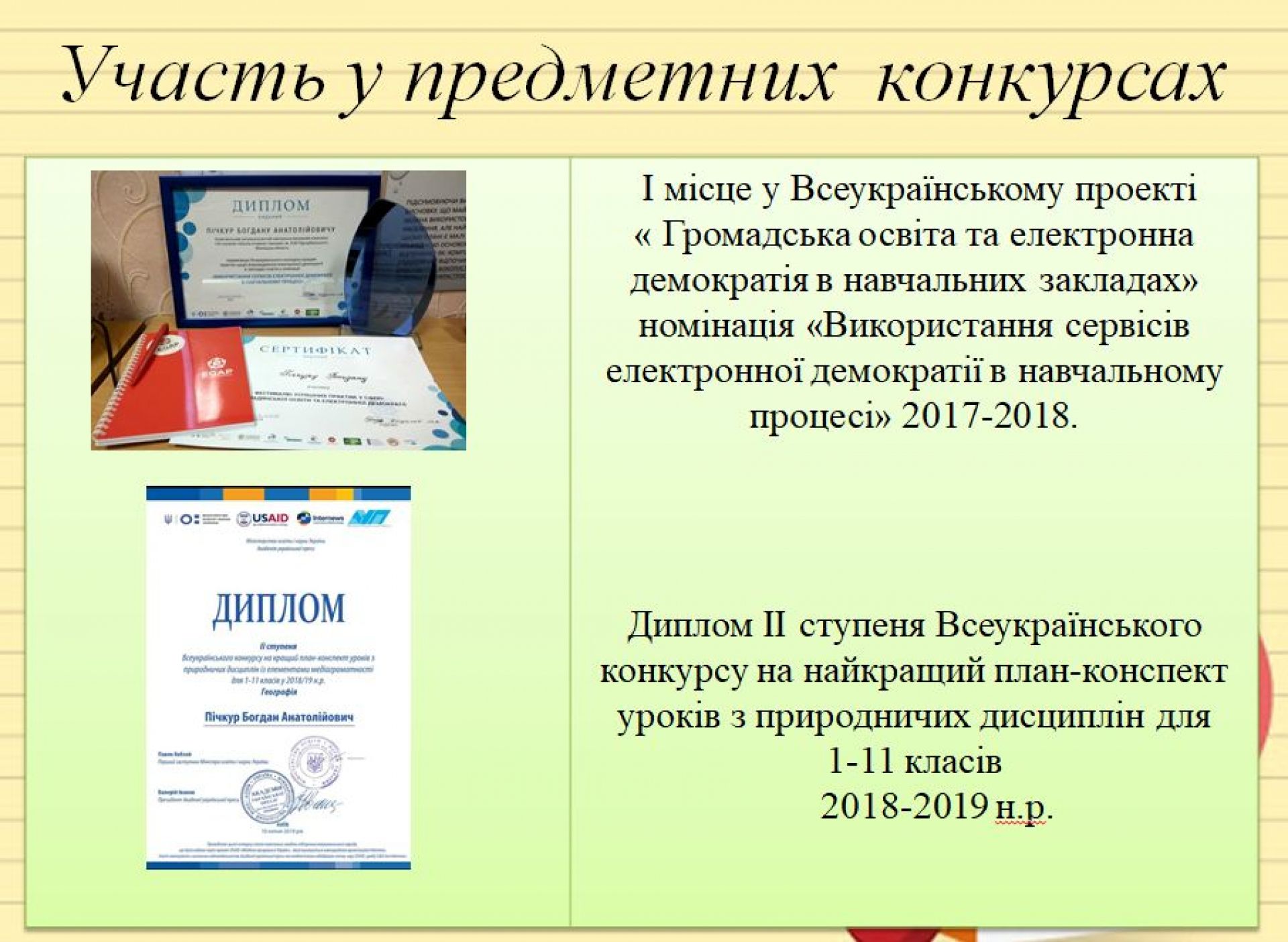 Переходимо до конкурсів. Загалом їх за семирічний учительський досвід було вдосталь. І обласні, і районні. Cам Богдан і його учні неодноразово займали призові місця і були переможцями. Але якщо брати Всеукраїнський рівень, то особисто для Богдана це вперше.