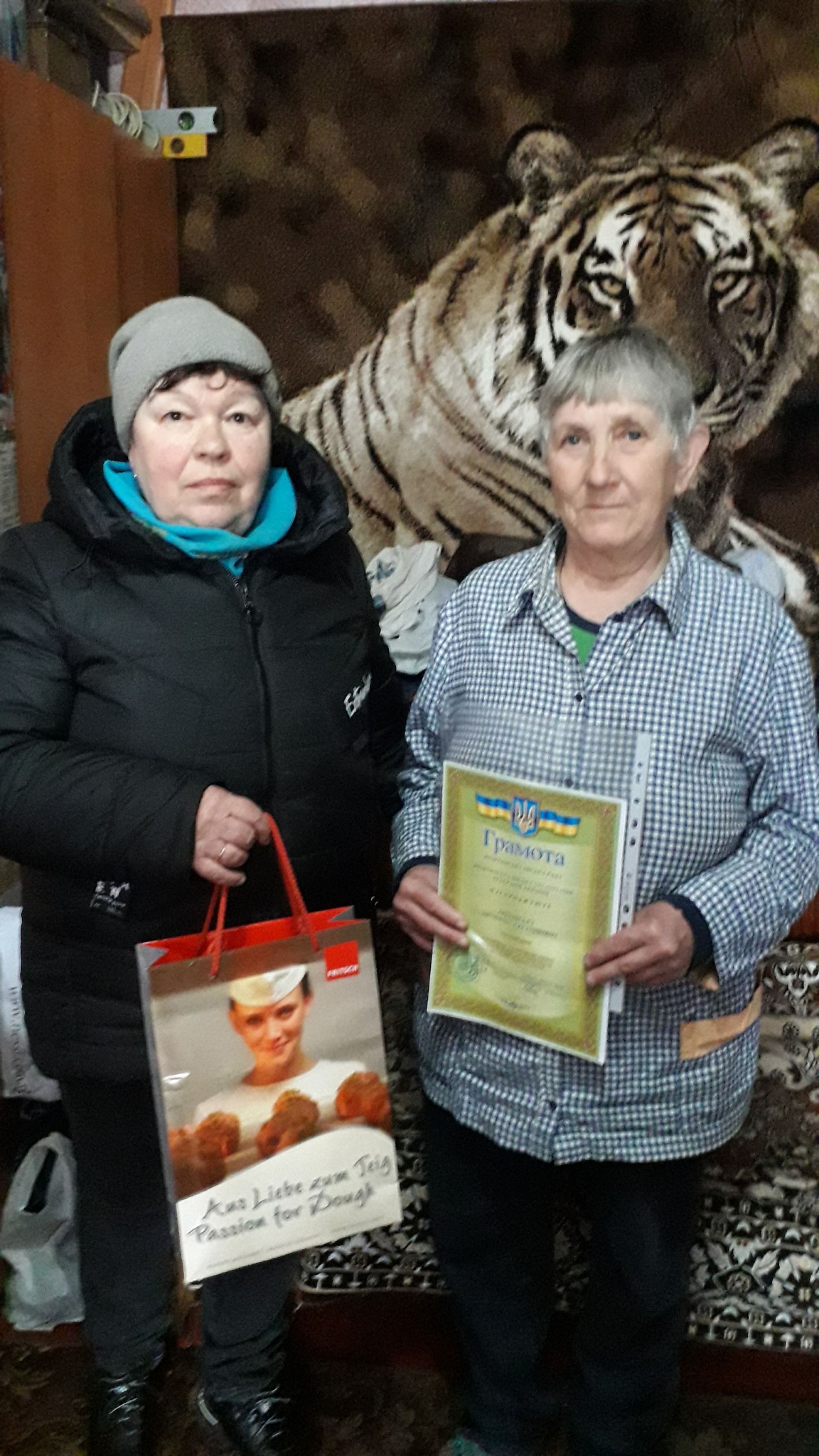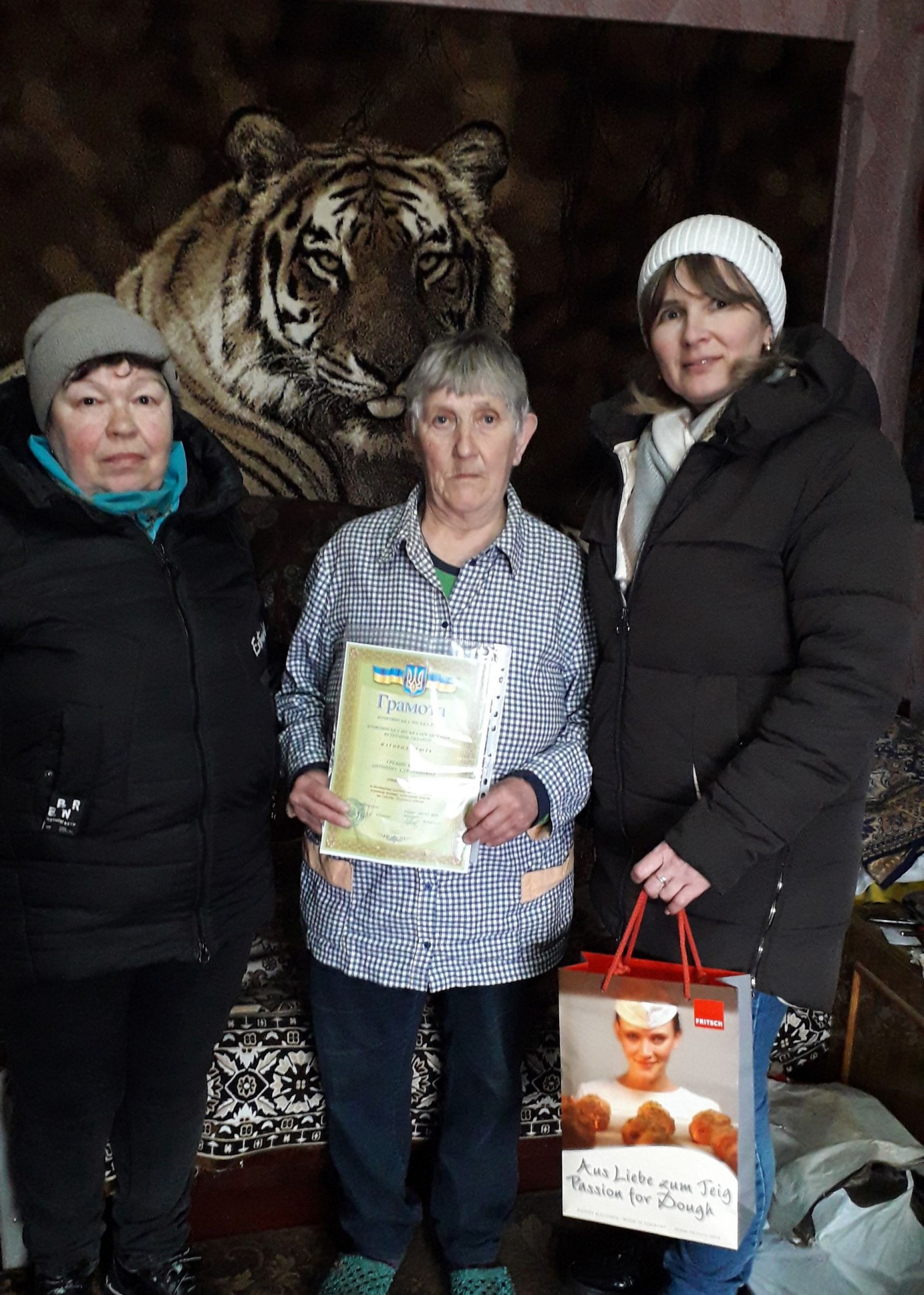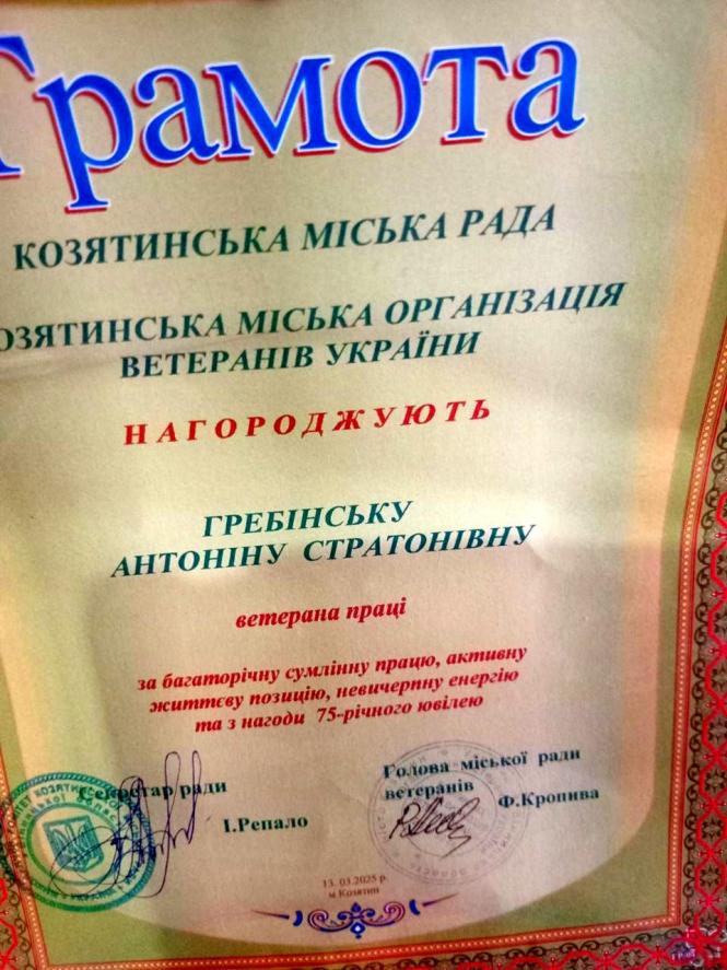 Окрім вітань, вони передали Антоніні Стратонівні, яка була приємно вражена увагою, подарунок та грамоту від Козятинської міської організації ветеранів України.