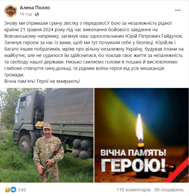 «Знову ми отримали сумну звістку з передової. У бою за незалежність рідної країни 21 травня 2024 року під час виконання бойового завдання на Вовчанському напрямку, загинув наш односельчанин Юрій Петрович Гайдучок. Загинув героєм за нас із вами, щоб ми тут почували себе у безпеці. Юрій, як і багато інших побратимів, мріяв про вільну незалежну Україну, будував плани на майбутнє, але не судилося їм здійснитися, бо поклав своє життя за незалежність та свободу нашої держави. Низько схиляємо голови в пошані й висловлюємо глибоке співчуття сину, доньці, та рідним воїна-героя від усіх мешканців громади».