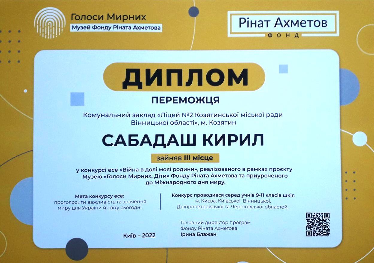 У конкурсі есе «Війна в долі моєї родини» козятинчанин Кирило Сабадаш посів переможне третє місце