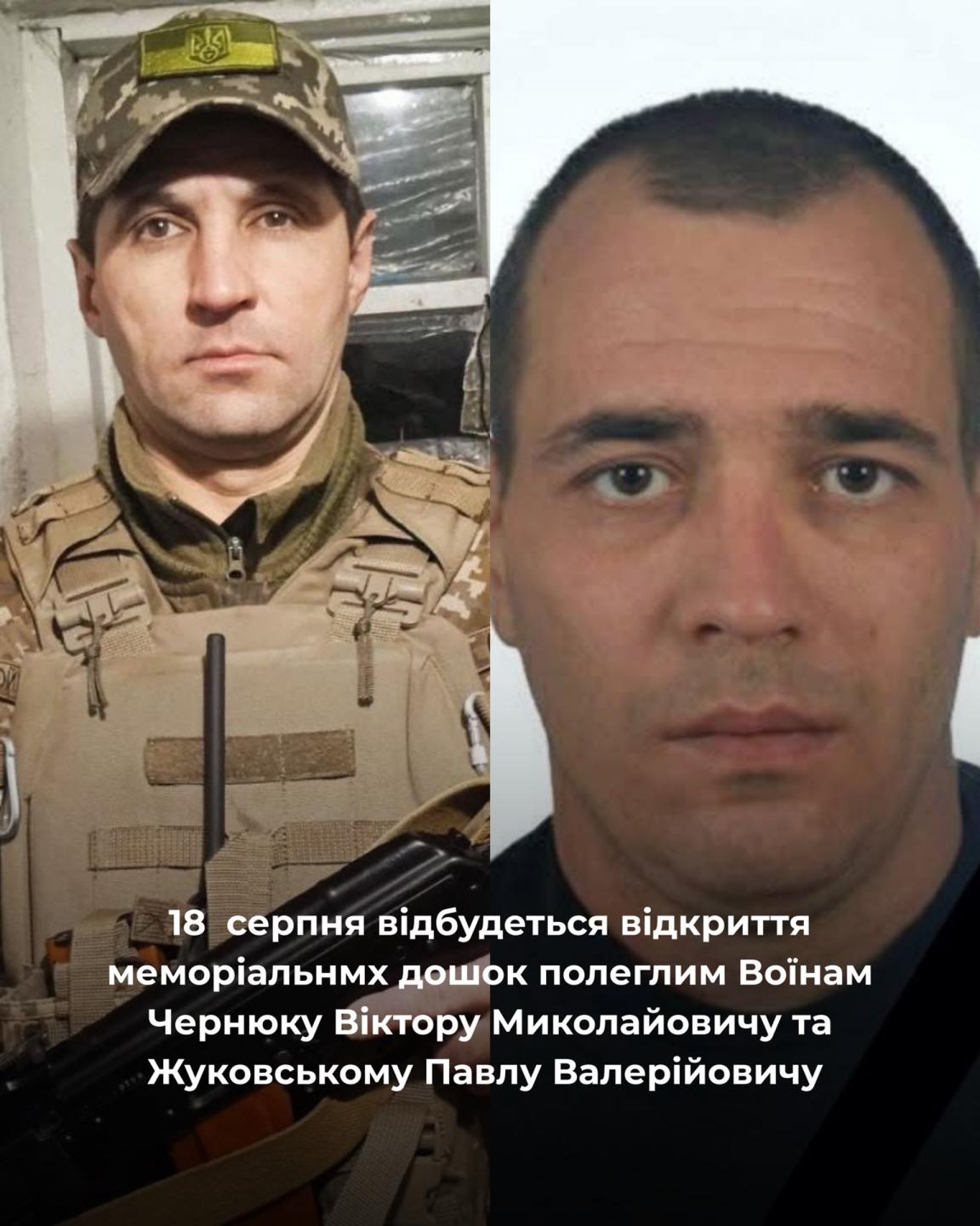 - У понеділок, 18 серпня, в Козятині відбудеться відкриття меморіальних дошок на честь полеглих воїнів — Віктора Чернюка та Павла Жуковського.