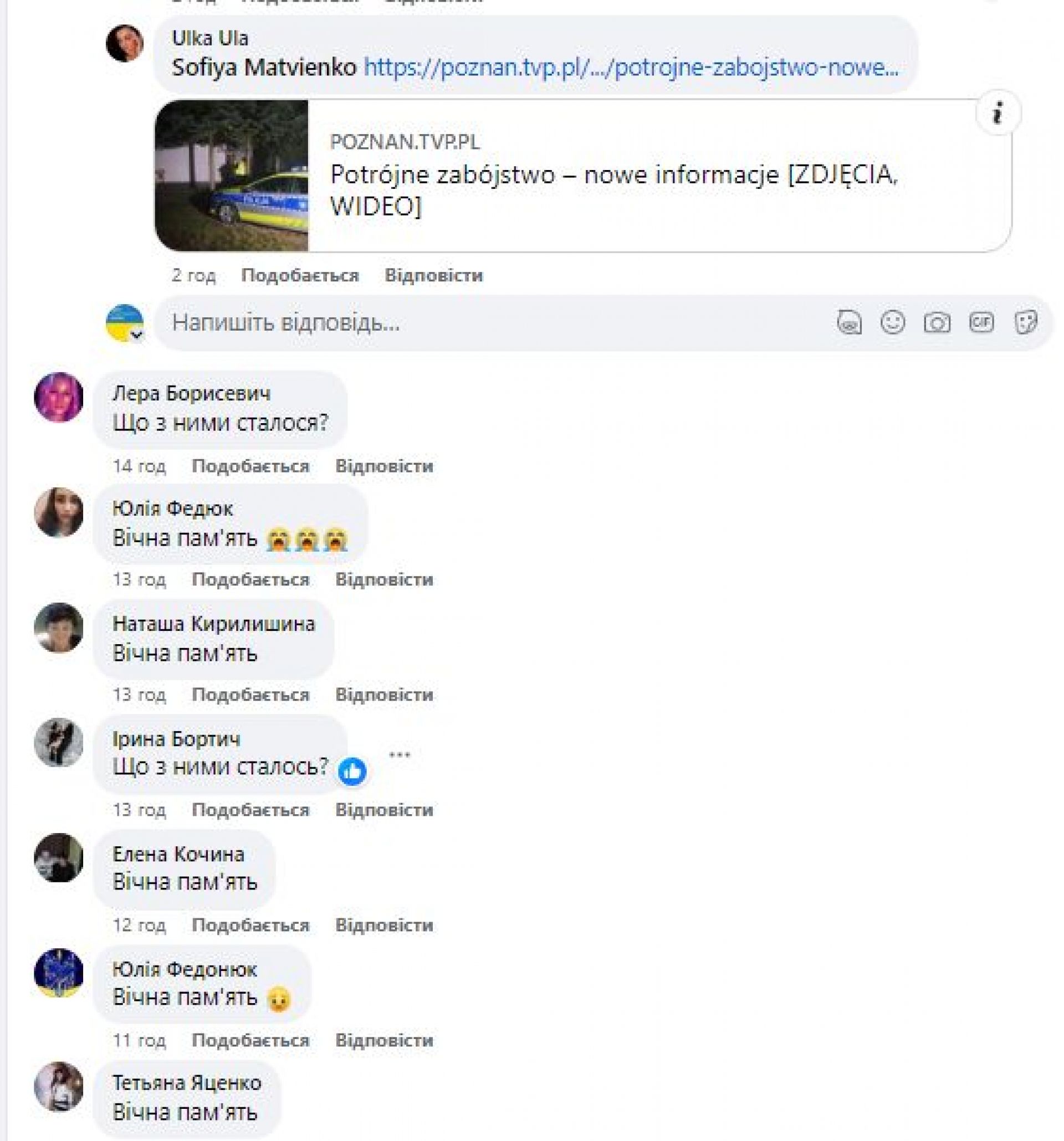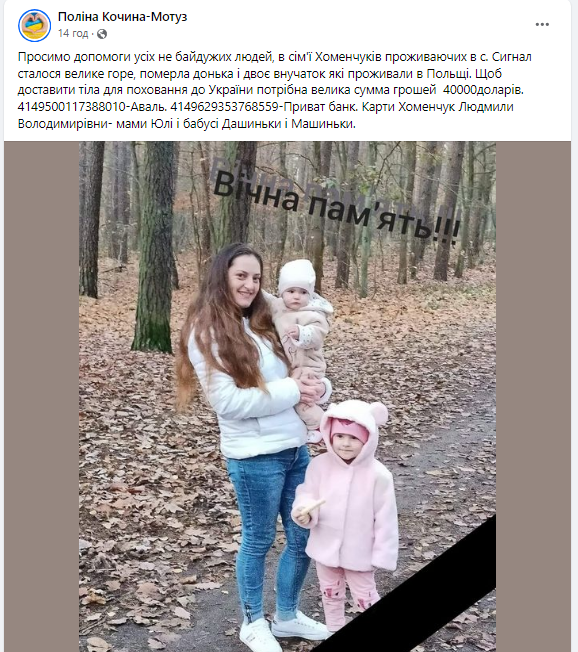 — Просимо допомоги усіх не байдужих людей, в сім'ї Хоменчуків проживаючих в с. Сигнал сталося велике горе, померла донька і двоє внучаток які проживали в Польщі. Щоб доставити тіла для поховання до України потрібна велика сума грошей 40000доларів, — написала Поліна Кочина-Мотуз