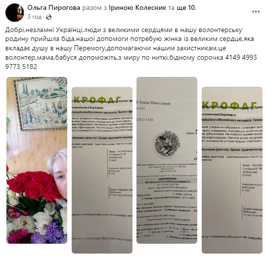 — Добрі, незламні Українці, люди з великими серцями. В нашу волонтерську родину прийшла біда, нашої допомоги потребує жінка із великим серце, яка вкладає душу в нашу Перемогу, допомагаючи нашим захисникам, це волонтер, мама, бабуся допоможіть, з миру по нитці, бідному сорочка, — йдеться у дописі
