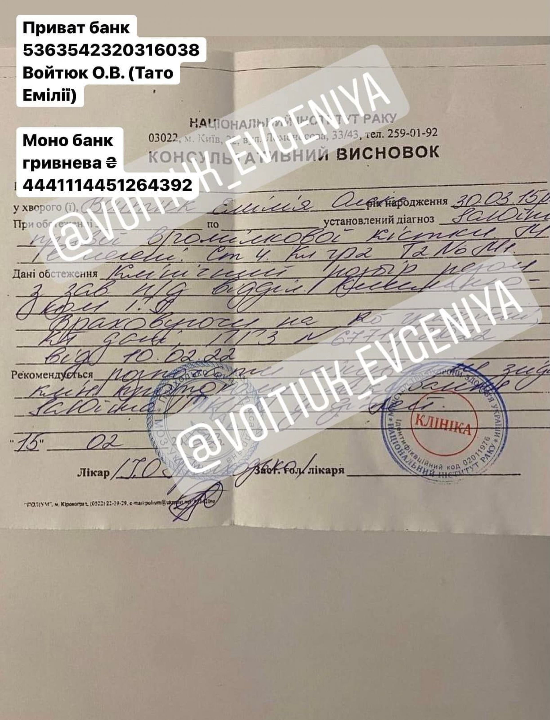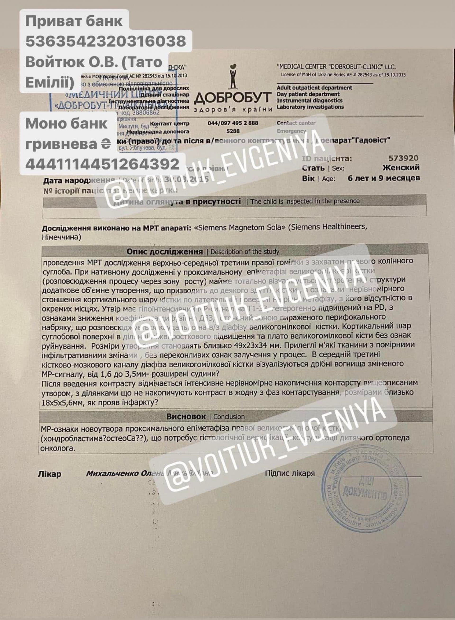 Родина просить близьких, друзів, знайомих і просто не байдужих людей допомогти подолати страшну хворобу. Адже самотужки вони не впораються з таким важким і довготривалим лікуванням. Попереду — шість курсів хіміотерапії, трансплантація кісткового мозку та трансплантація ураженої частини кістки. А для цього потрібно сила та велика сума грошей. Рахунок на лікування Емілії ще не виставили, адже чекають на відповідь з ізраїльської клініки, куди направили всі необхідні для того документи.