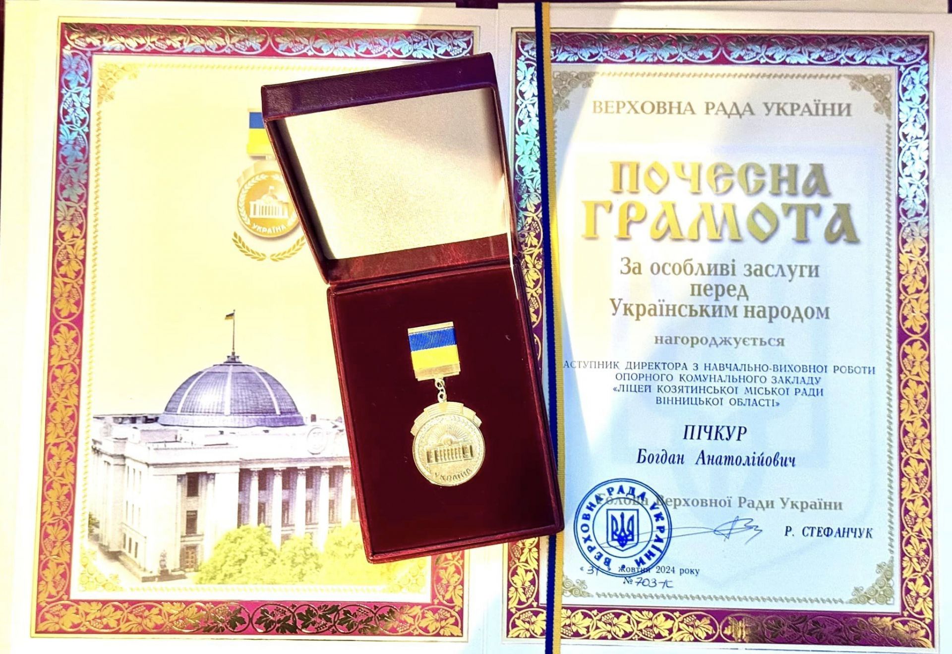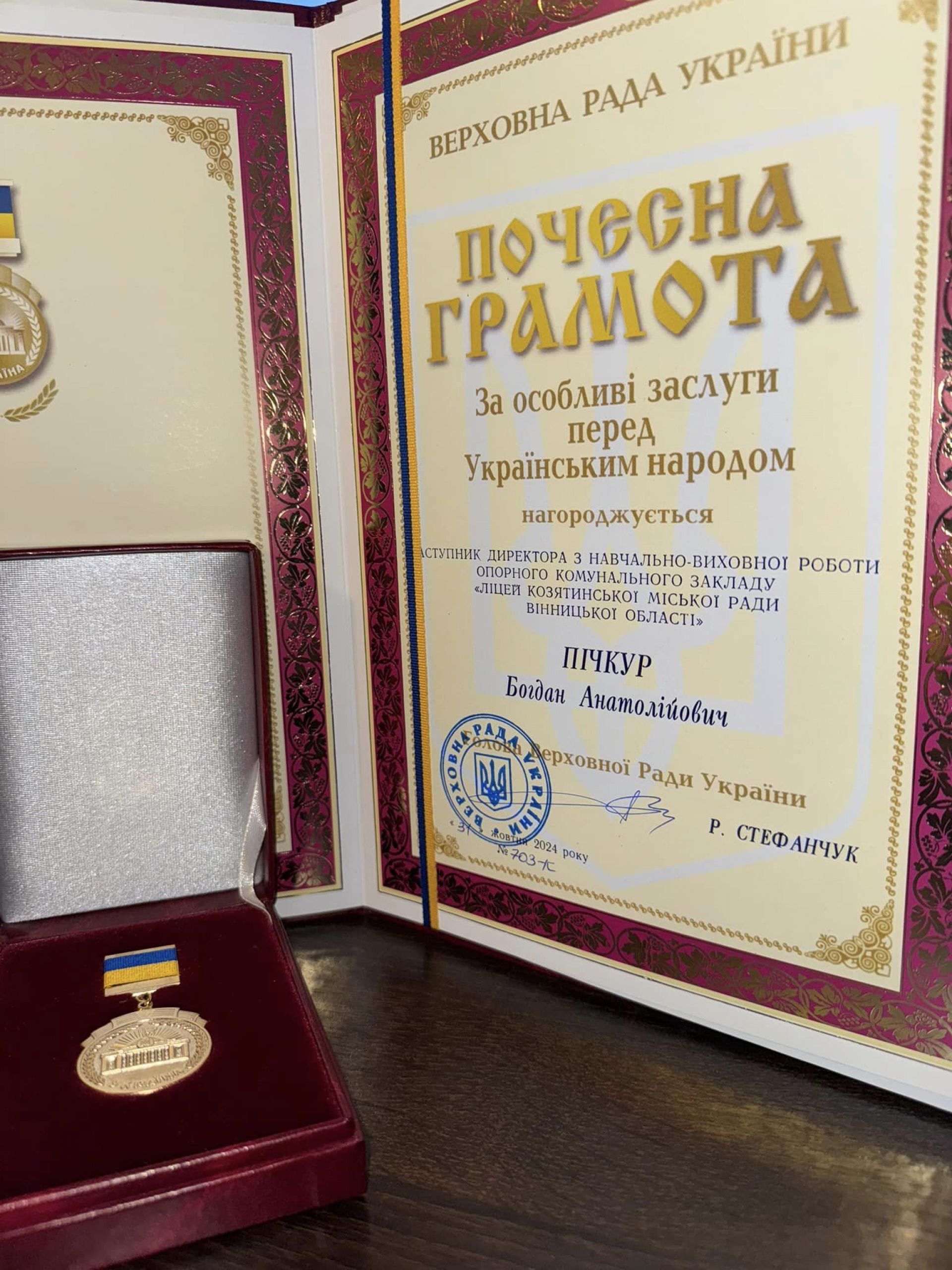 - Почесну грамоту Верховної Ради України «За особливі заслуги перед Українським народом» отримав вчитель географії, заступник директора з навчально-виховної роботи Козятинського опорного ліцею Богдан Пічкур