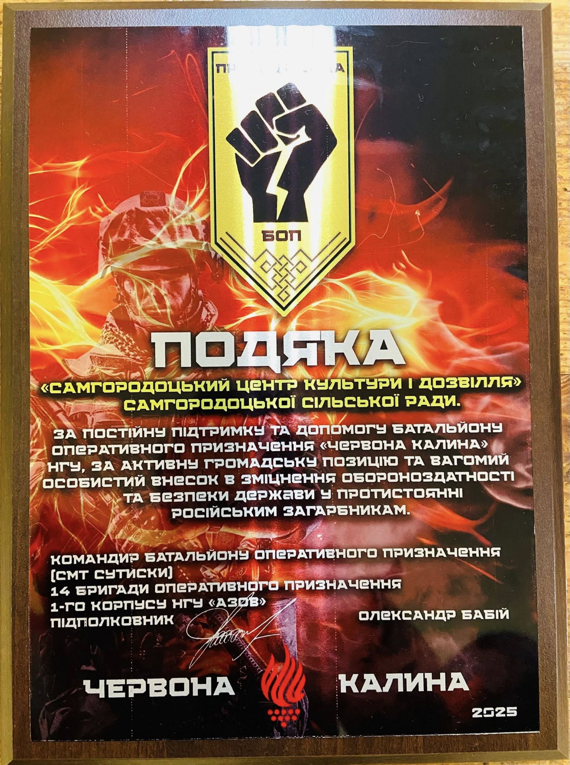 - Самгородоцький центр культури та дозвілля отримав зворотний зв’язок і подяку від військовослужбовців — уродженців громади, для яких під час нещодавніх благодійних заходів збирали допомогу.