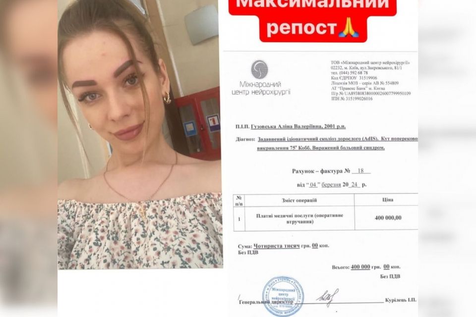 - Козятинчанці Аліні Гузовській потрібна наша з вами фінансова підтримка. У 21-річної дівчини важкий діагноз — задавнений ідіопатичний сколіоз дорослого, кут поперекового викривлення 75 градусів Кобб., виражений больовий синдром.
