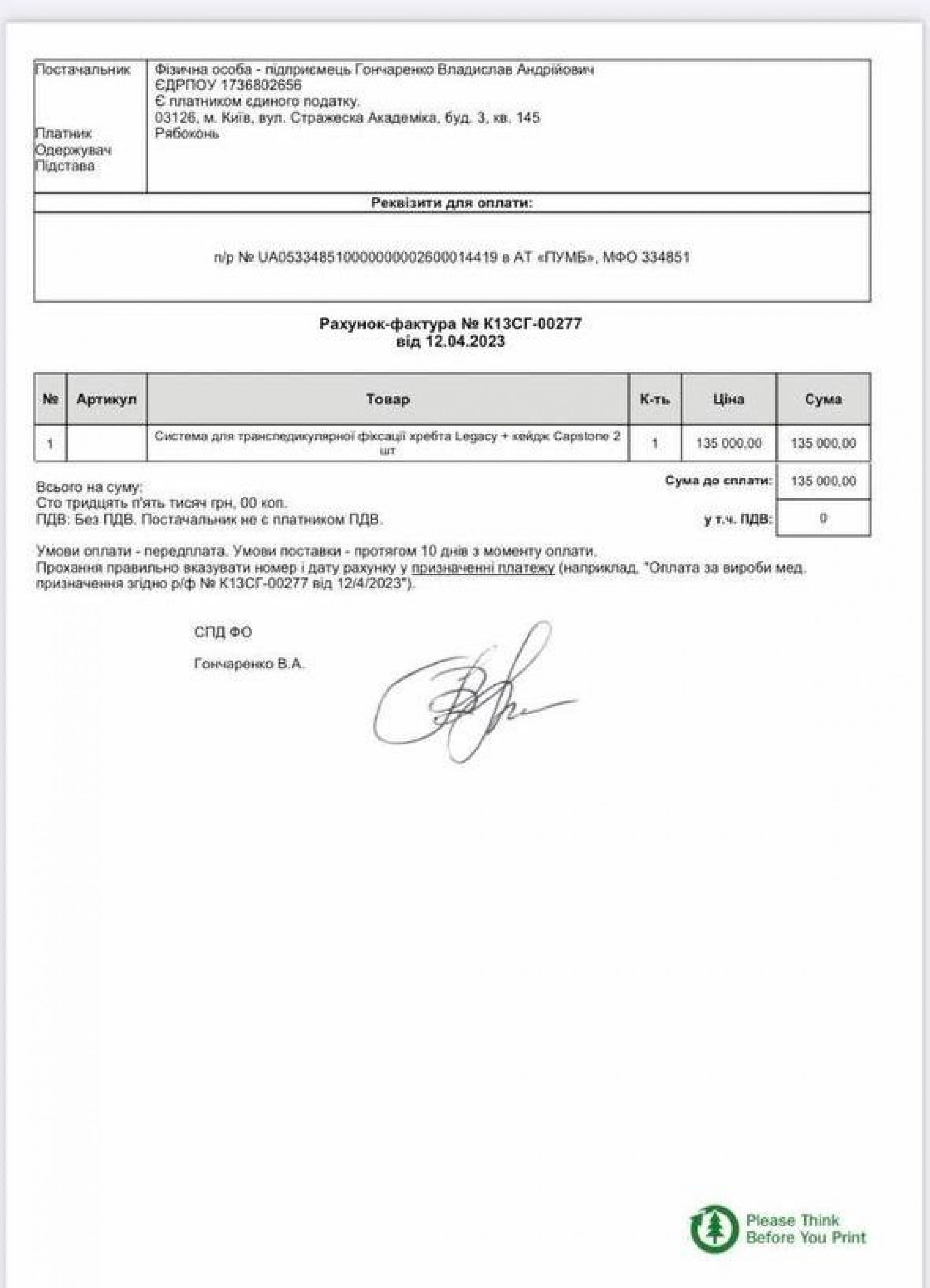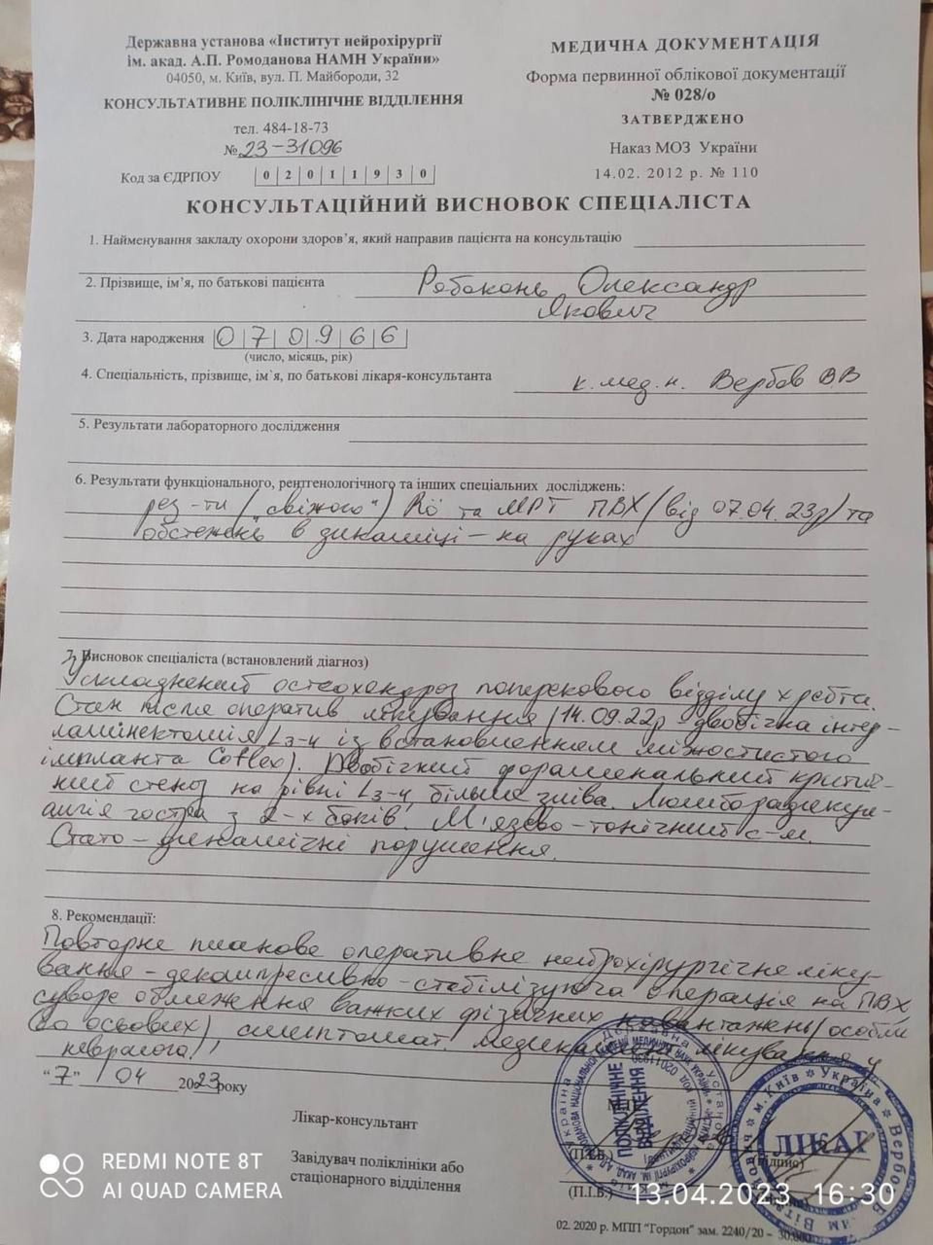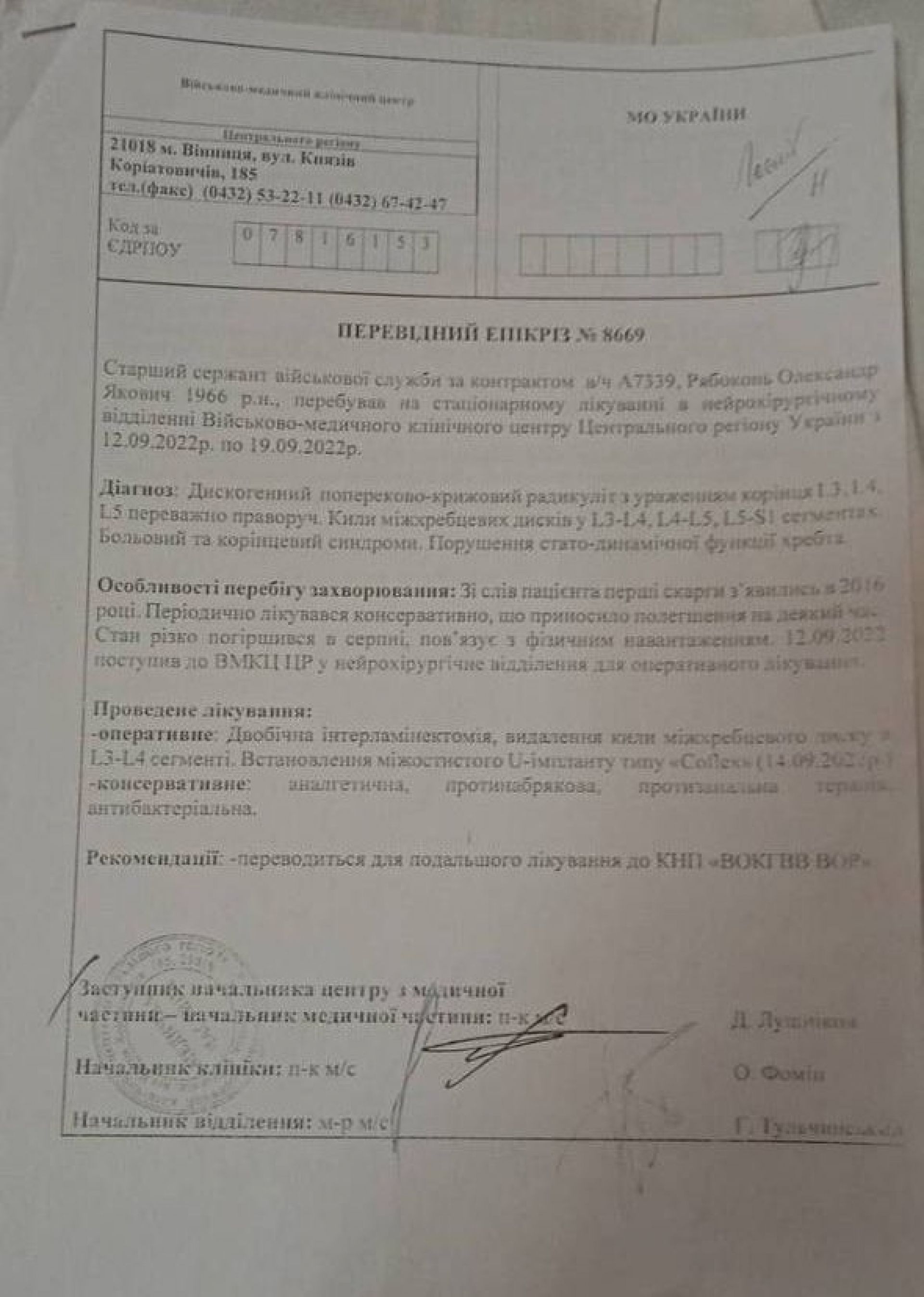 — Доброго дня, мій чоловік Рябоконь Олександр Якович перебував в зоні бойових дій, місто Бахмут. Зараз має великі проблеми з хребтом. Був прооперований у вересні 2022 р. видалили 2 грижі і встановили імплант. Тривалий час лікувався, покращень немає, пішли ускладнення. Постійний біль у хребті, віддає у праву ногу, 7 місяців приймає знеболюючі. Має виразкову хворобу, грижу стравоходу, втратив апетит та схуд на 16 кг, — повідомила дружина військового. — Необхідна повторна операція на хребті, в інституті нейрохірургії, цей імплант будуть видаляти і ставити 2 нових.