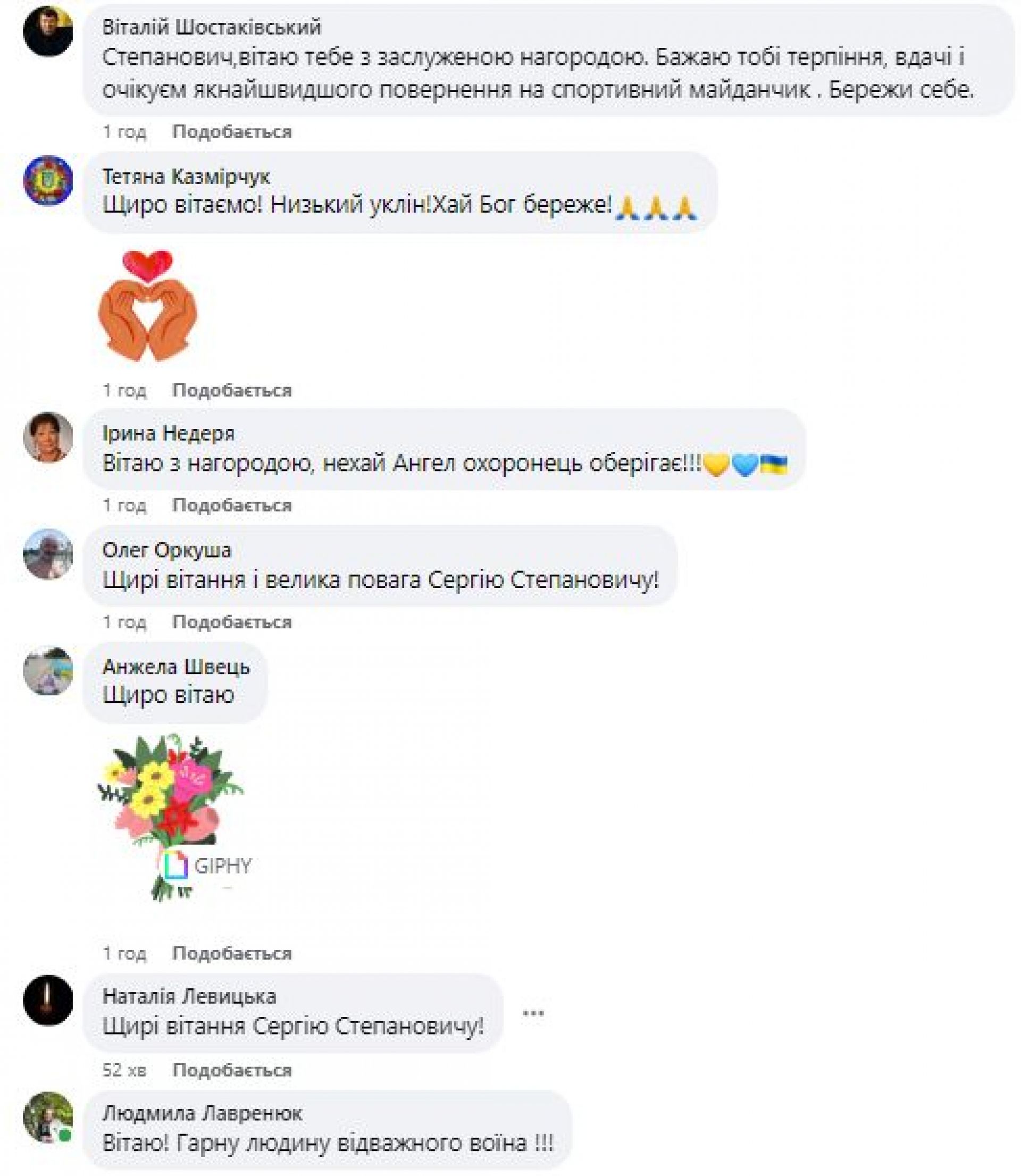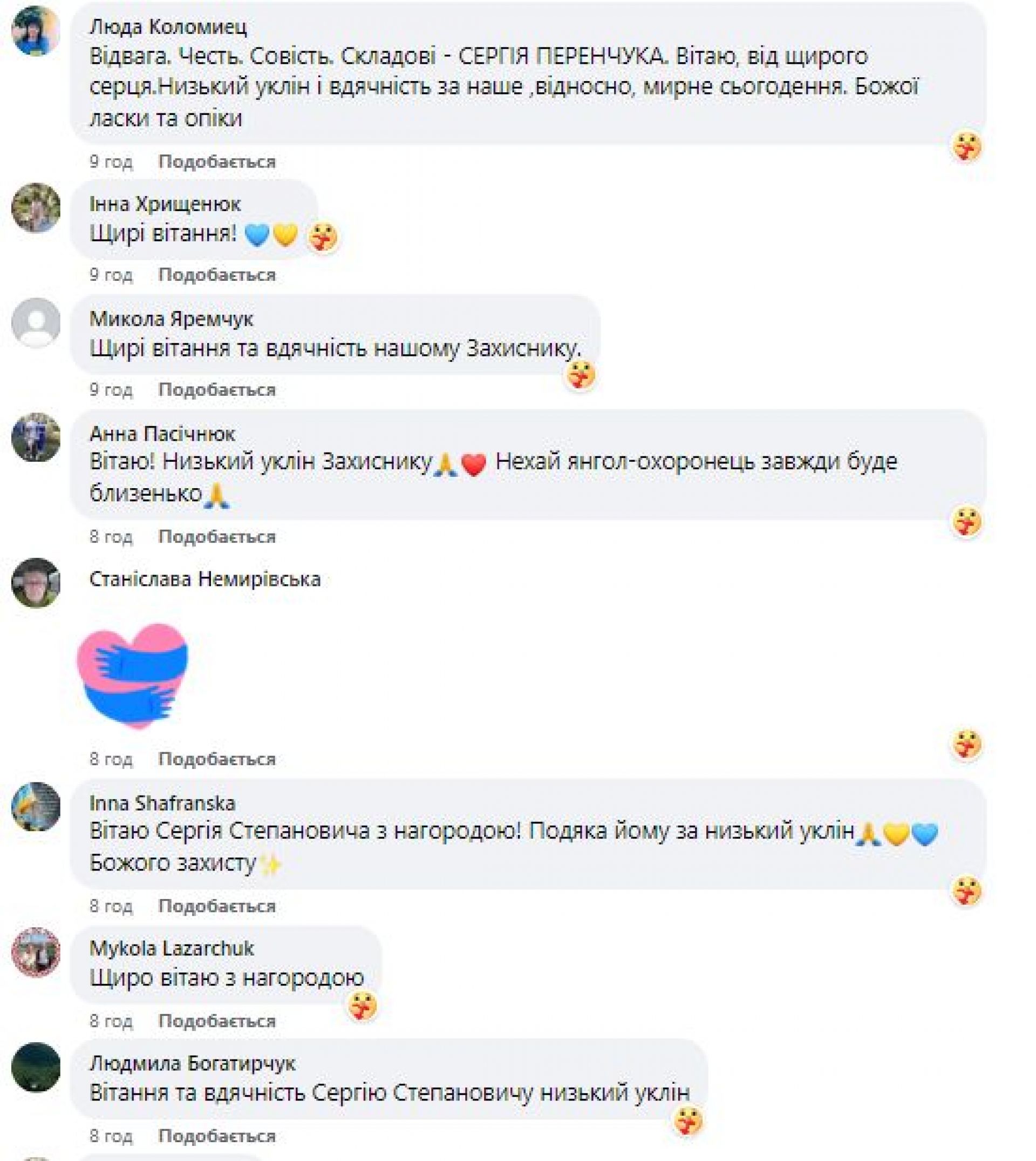 — Шановні земляки, хочу від себе особисто і, сподіваюсь, від багатьох із вас, привітати депутата Козятинської міської ради, члена групи позафракційних депутатів — Сергія Перенчука із військовою нагородою. Сергій Степанович Перенчук зараз несе службу на східних рубежах нашої країни. Його військовий талант та відвага були достойно оцінені та відзначені. Хочеться лише побажати, щоб удача завжди була поруч із нашими захисниками. Щоб їх сила і відвага були достойно оцінені, а ми всі, щоб були достойні подвигу наших земляків та й усіх українців, хто став на захист держави. Слава Україні, — написала Аліна Діденко