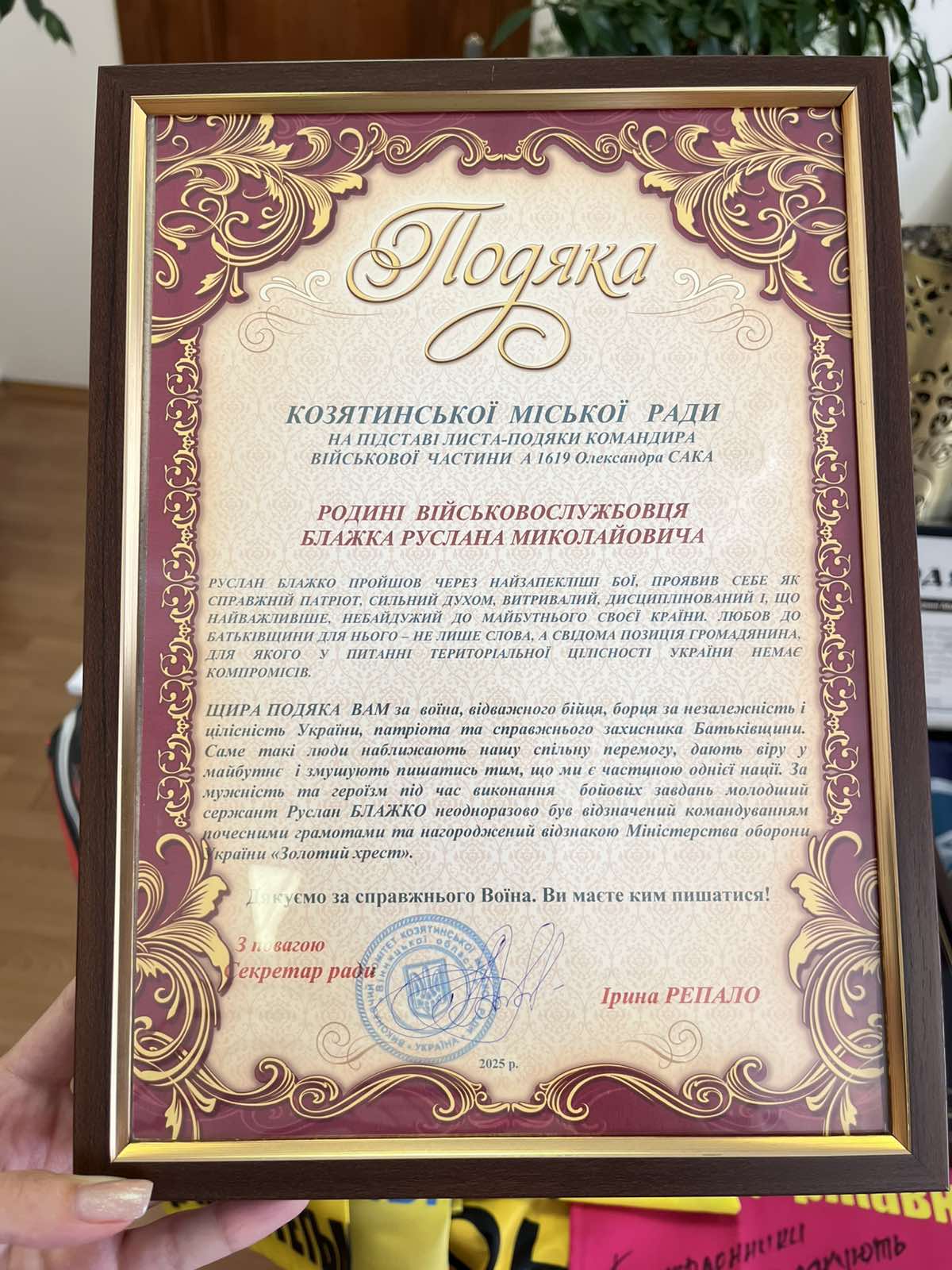 — Ми щиро вдячні за його подвиг, за те, що він щоденно ризикує життям заради нашої свободи та майбутнього. Це велика честь для нашої громади, що такі віддані та сміливі люди, як Руслан Блажко, є нашими земляками, — пишуть у міській раді