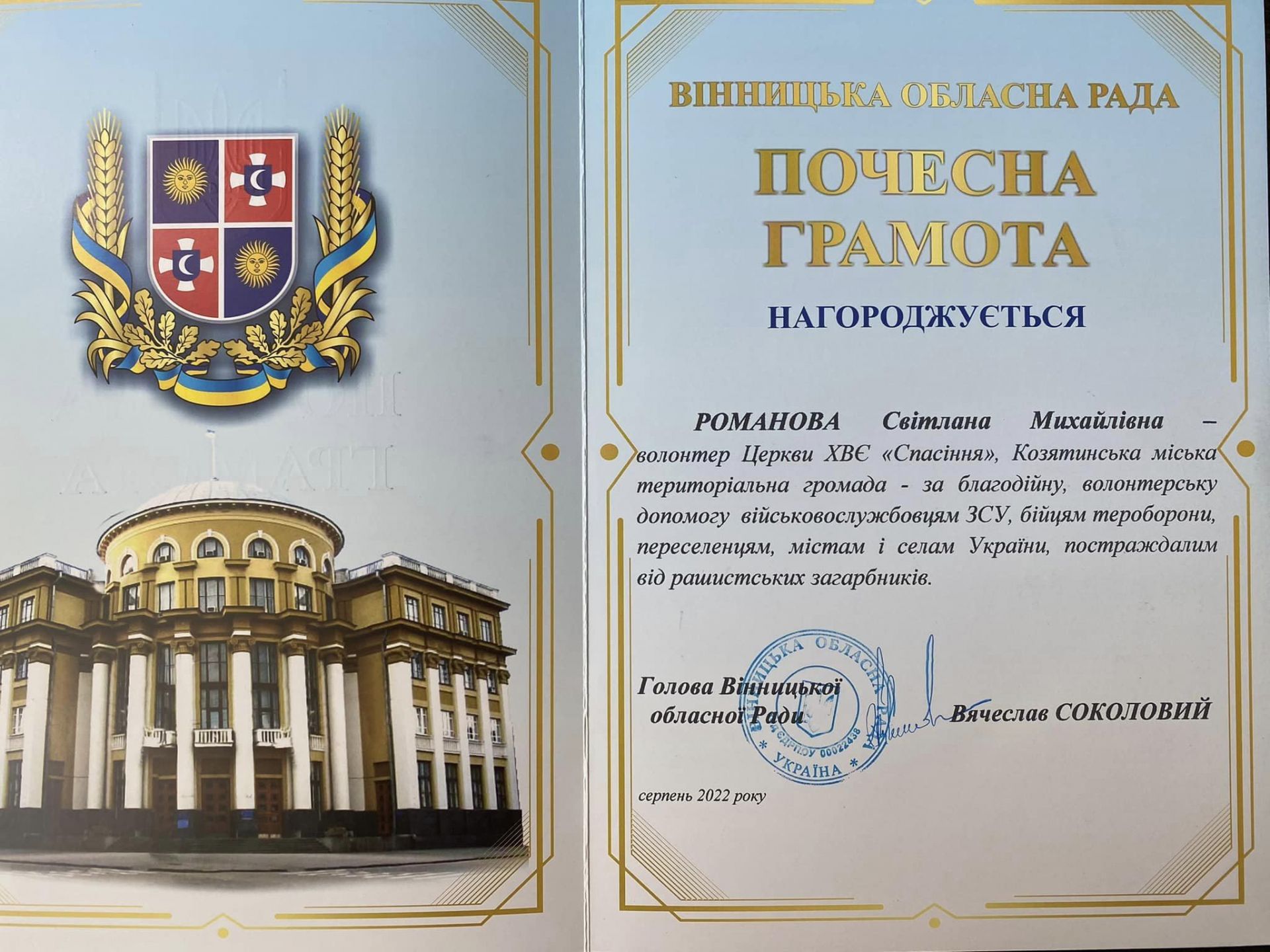 - Романову Світлану Михайлівну - волонтера Церкви ХВЄ «Спасіння»;