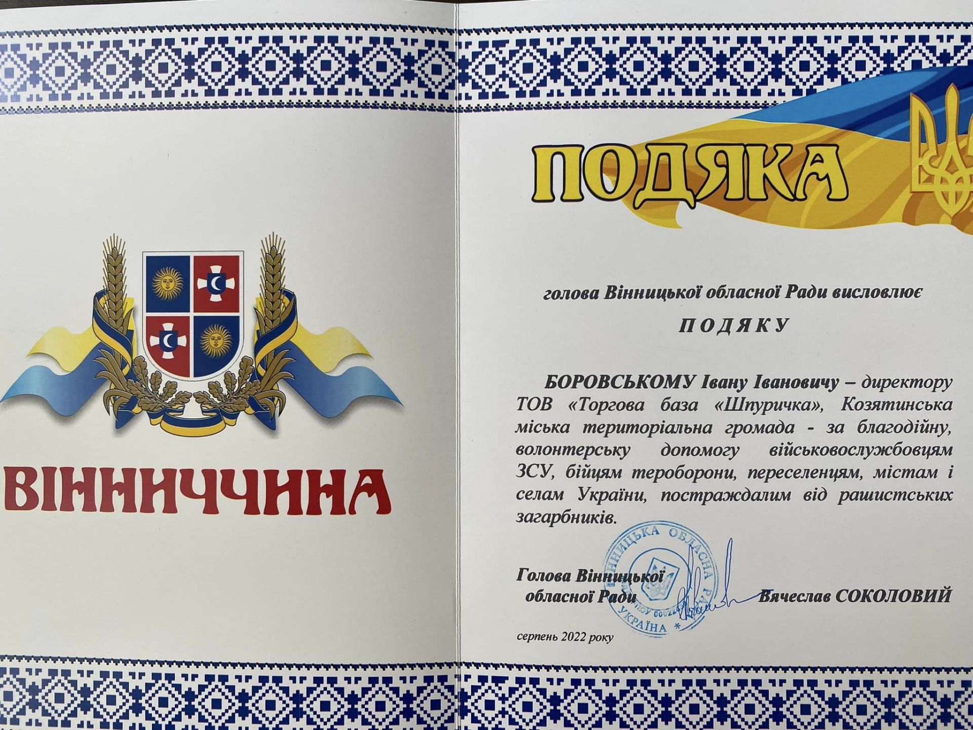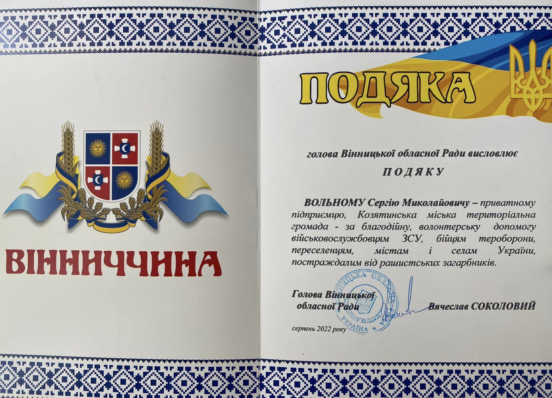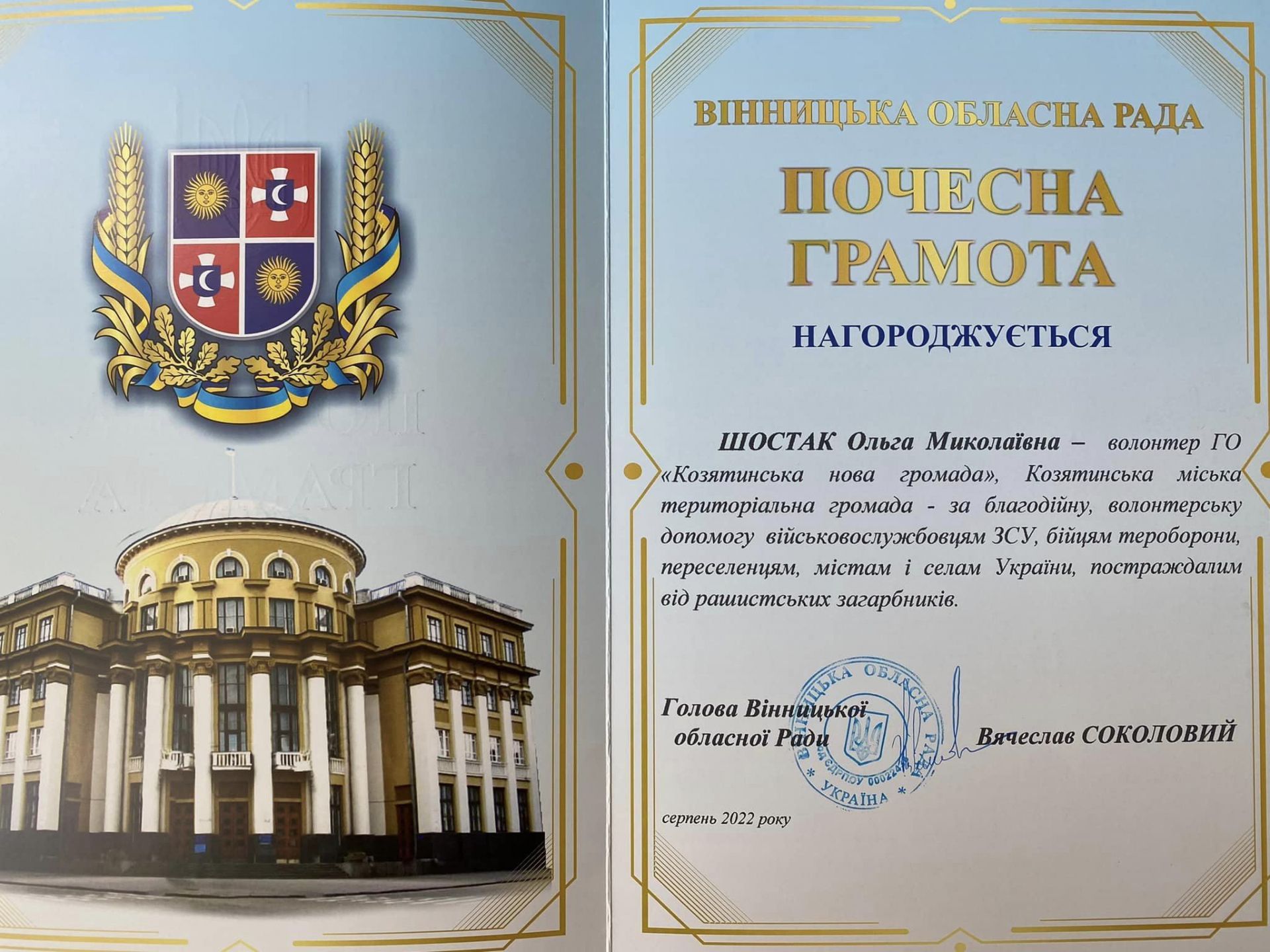 - До Дня незалежності Вінницька обласна рада нагородила почесними грамотами чотирьох волонтерів з Козятинської громади