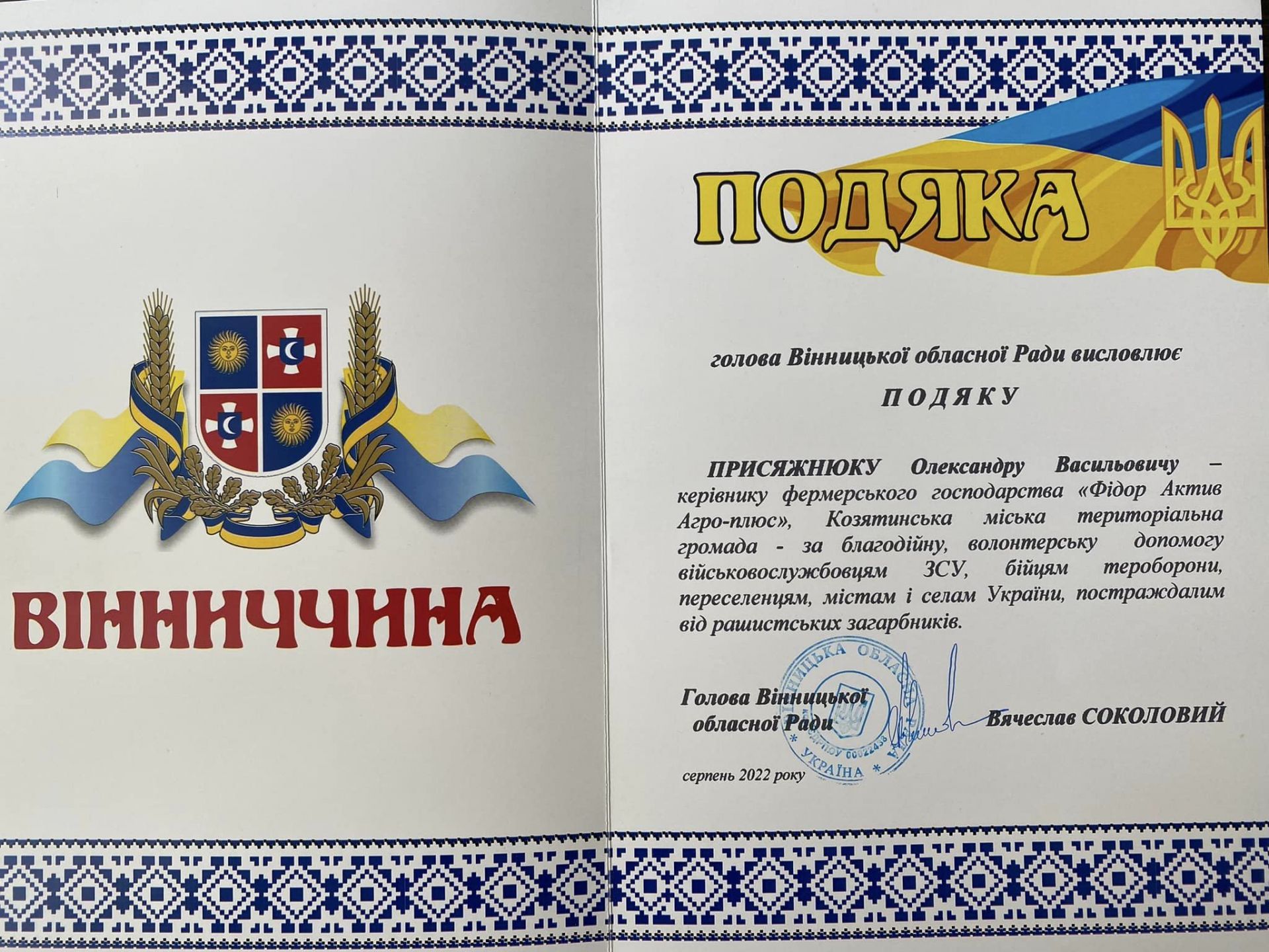 - Присяжнюк Олександра Васильовича - керівника фермерського господарства «Фідор Актив Агро-плюс»;