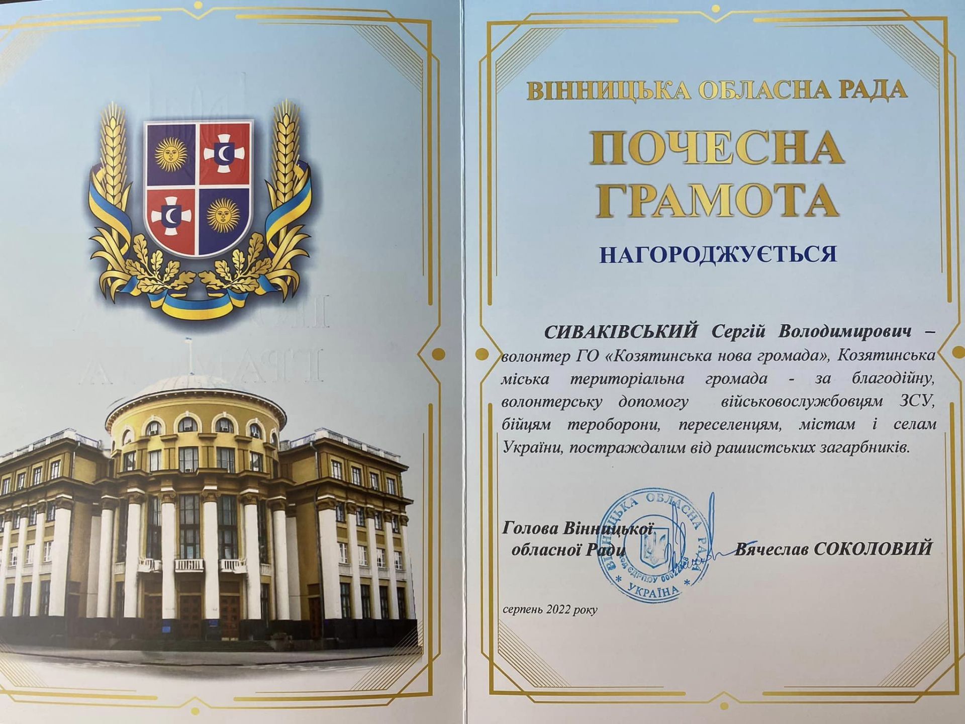 - Сиваківського Сергія Володимировича - волонтера ГО «Козятинська нова громада»;