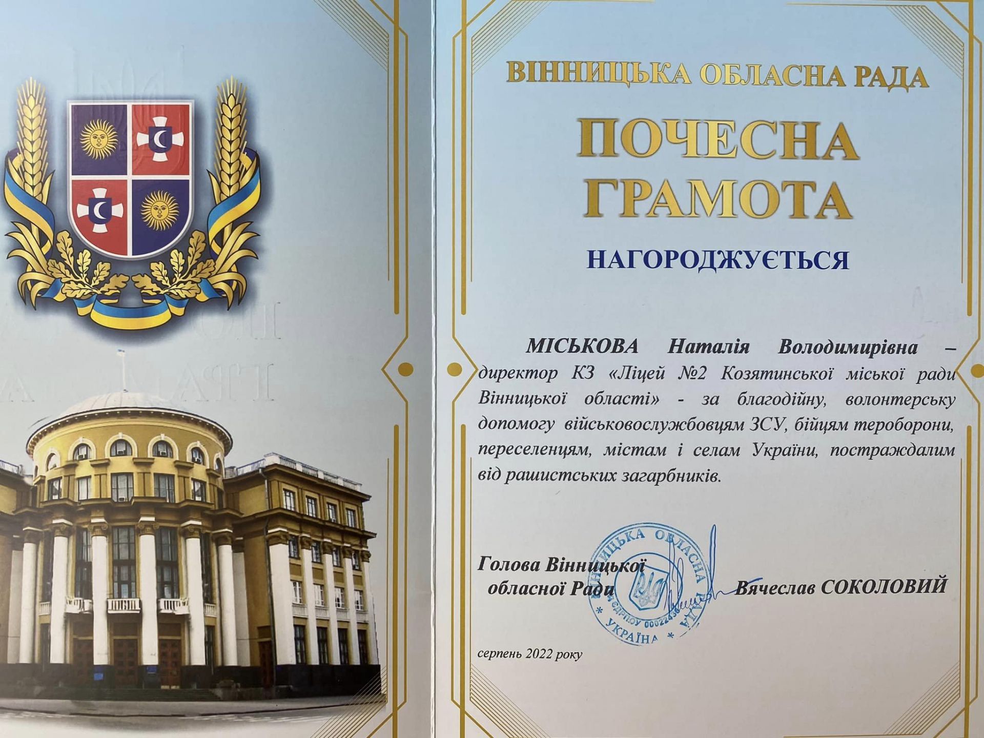 - Міськову Наталію Володимирівну - директора Ліцею №2 Козятинської міської ради;
