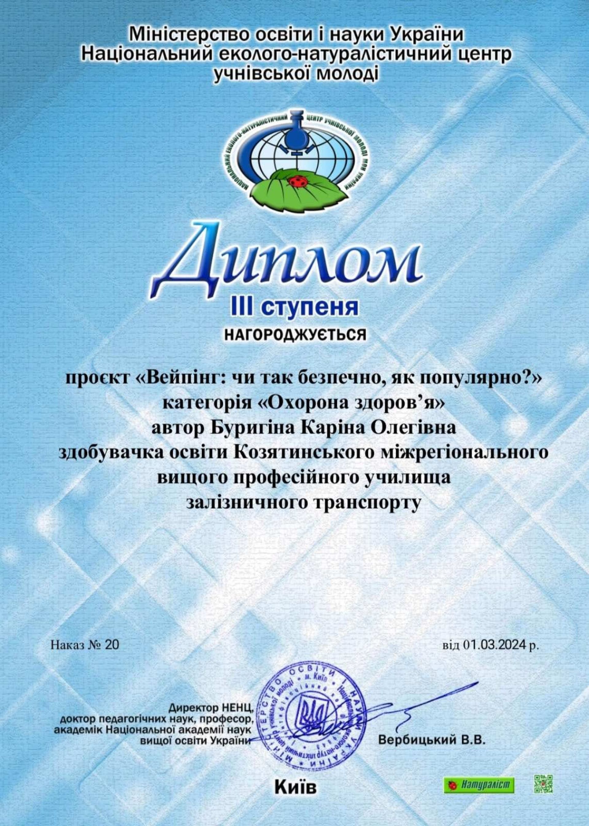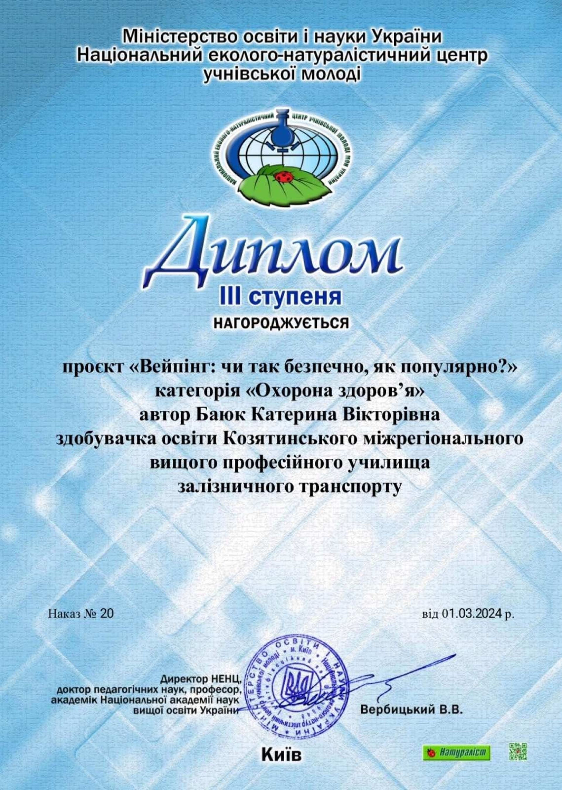 Як повідомляють на офіційній сторінці училища, учасники конкурсу під керівництвом викладача хімії Наталії Заїчко представили проєкт на тему «Вейпінг: чи так безпечно, як популярно?» (з.о. І-го курсу Катерина Баюк та Каріна Буригіна) та проєкт «Хід конем: іпотерапія» (з.о. ІІ-го курсу Анастасія Крамаренко).