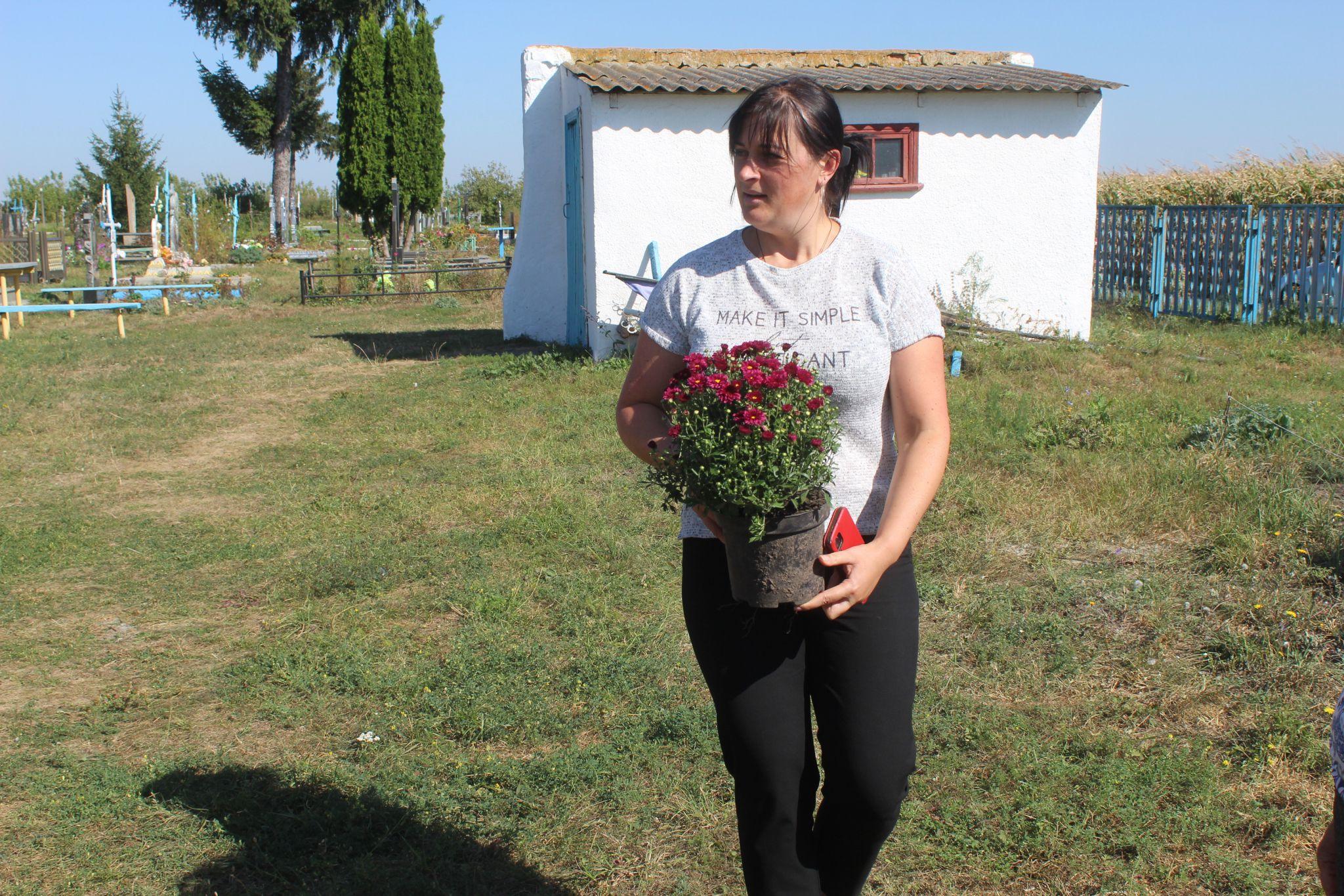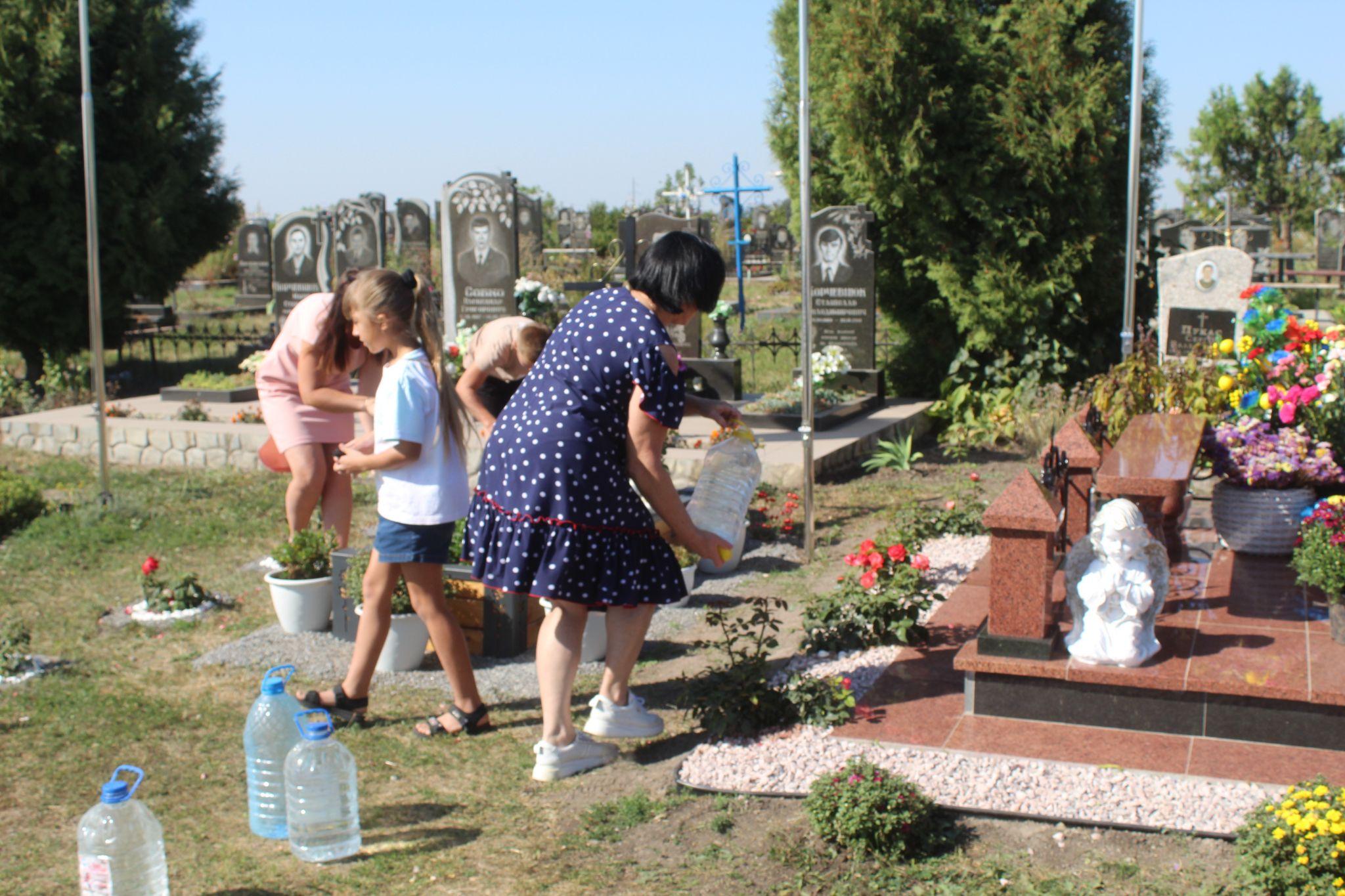 На кладовищі славного воїна і всіх Героїв України пом’янули хвилиною мовчання та стали поливати біля пам’ятників Героїв квіти. Старости села Олени Борчаківської ми запитали, як вдається в таку засуху мати комфортні умови для росту квітів.